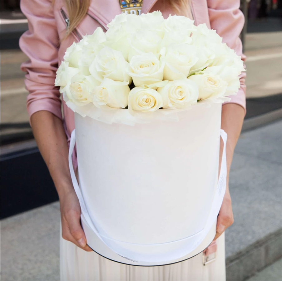 Белоснежные вывернутые розы дополнены бутонами Джумилии в одном цилиндре. Лепестки раскрыты широко, создавая объемную текстуру с мягкими переходами тона.