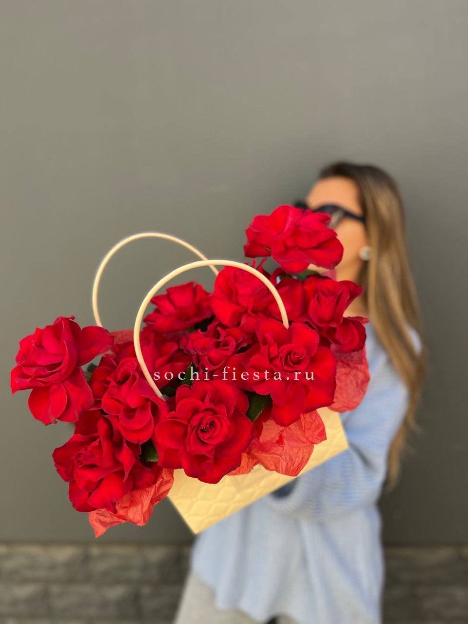 Вывернутые лепестки раскрывают внутреннюю структуру бутона и добавляют графичности всей композиции. Пятнадцать роз собраны в плотную группу с четким силуэтом.
