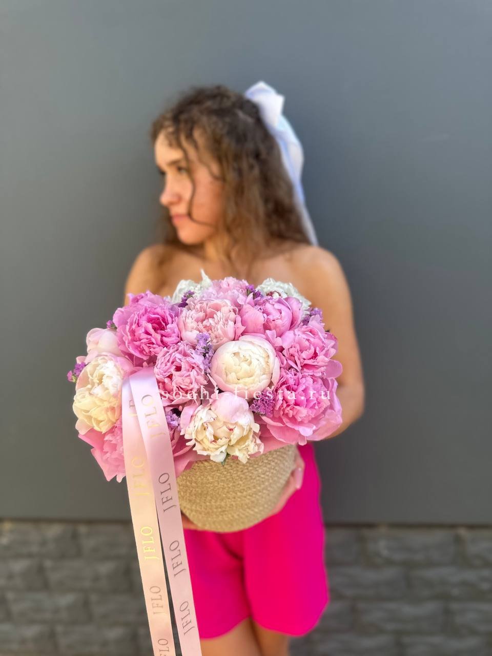 пионы, джутовое кашпо - D16, эвкалипт, лента, упаковка.