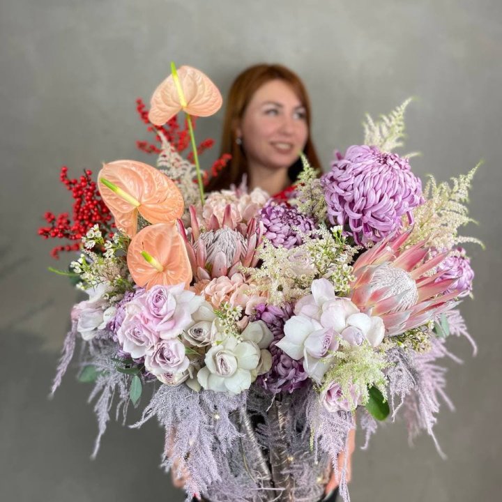 Авторские букеты гиганты в Мурманске — формат для тех событий в жизни города, когда обычного букета недостаточно. Юбилей 50 лет, свадьба, открытие бизнеса, значимое корпоративное поздравление — именно к таким поводам клиент заказывает гигантский авторский букет, который невозможно не заметить. Флорист в Мурманске создаёт авторские букеты гиганты из 101 и более роз, пионовые гиганты в сезоне, корзины-гиганты для торжественных вручений. Именно масштаб флористического жеста делает момент незабываемым для получателя и всех присутствующих.