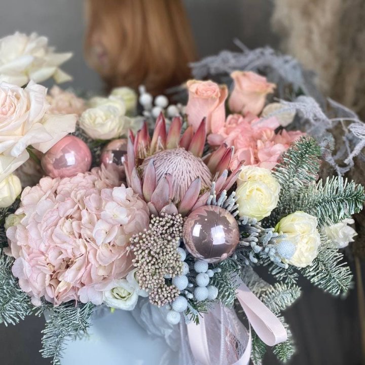 - Зимний гигант из роз — масштабный монобукет из долгостойких роз для зимних событий.