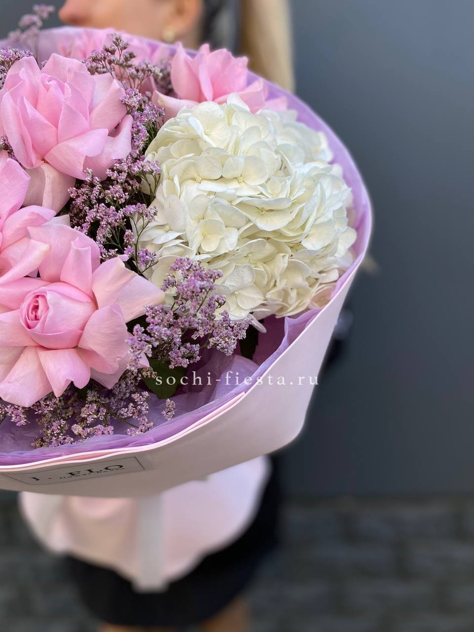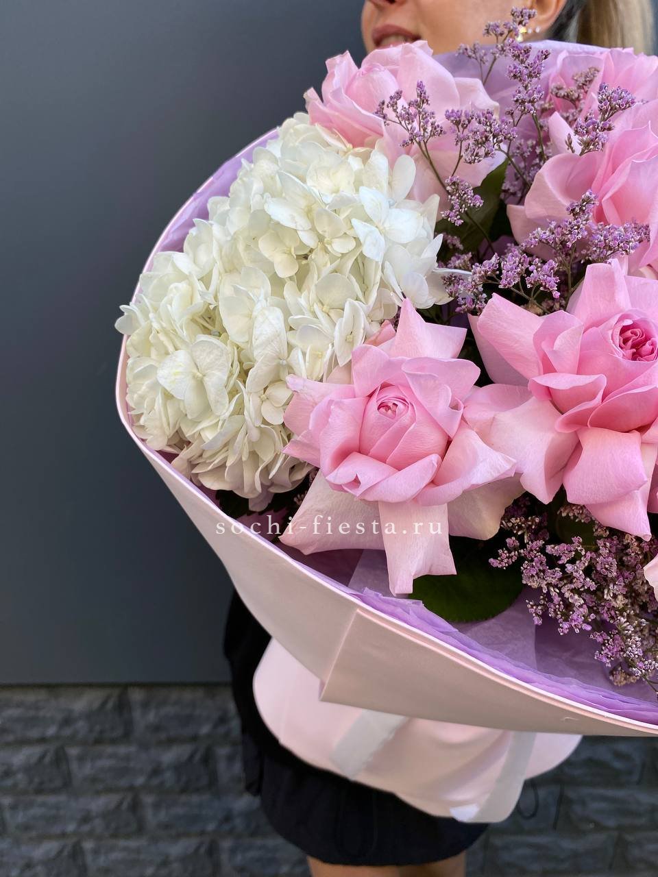 Букет с вывернутыми розами и пушистыми шапками гортензии создает легкое французское настроение. Лимониум вплетается тонкими ветвями, добавляя воздуха между бутонами.