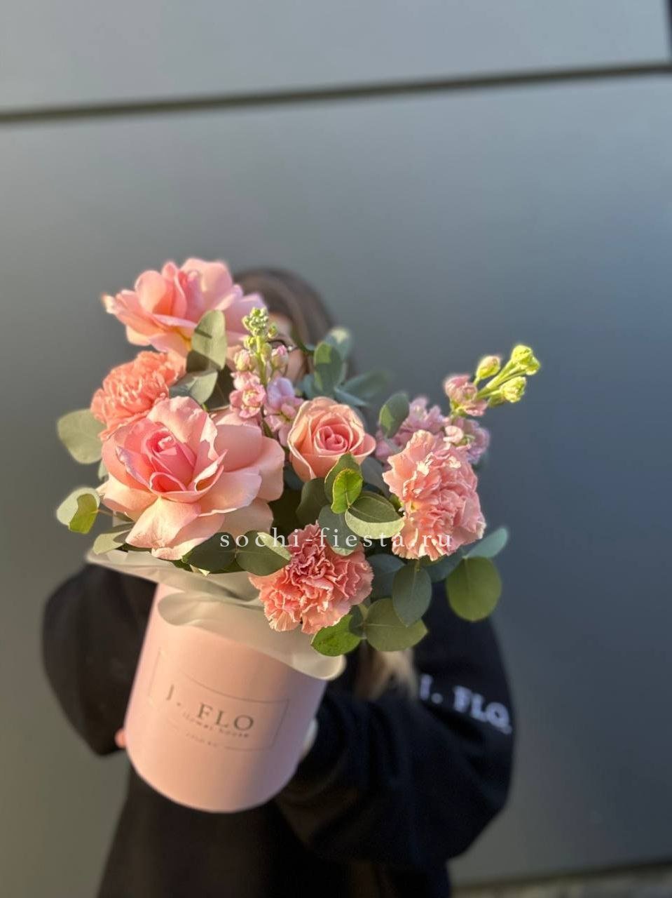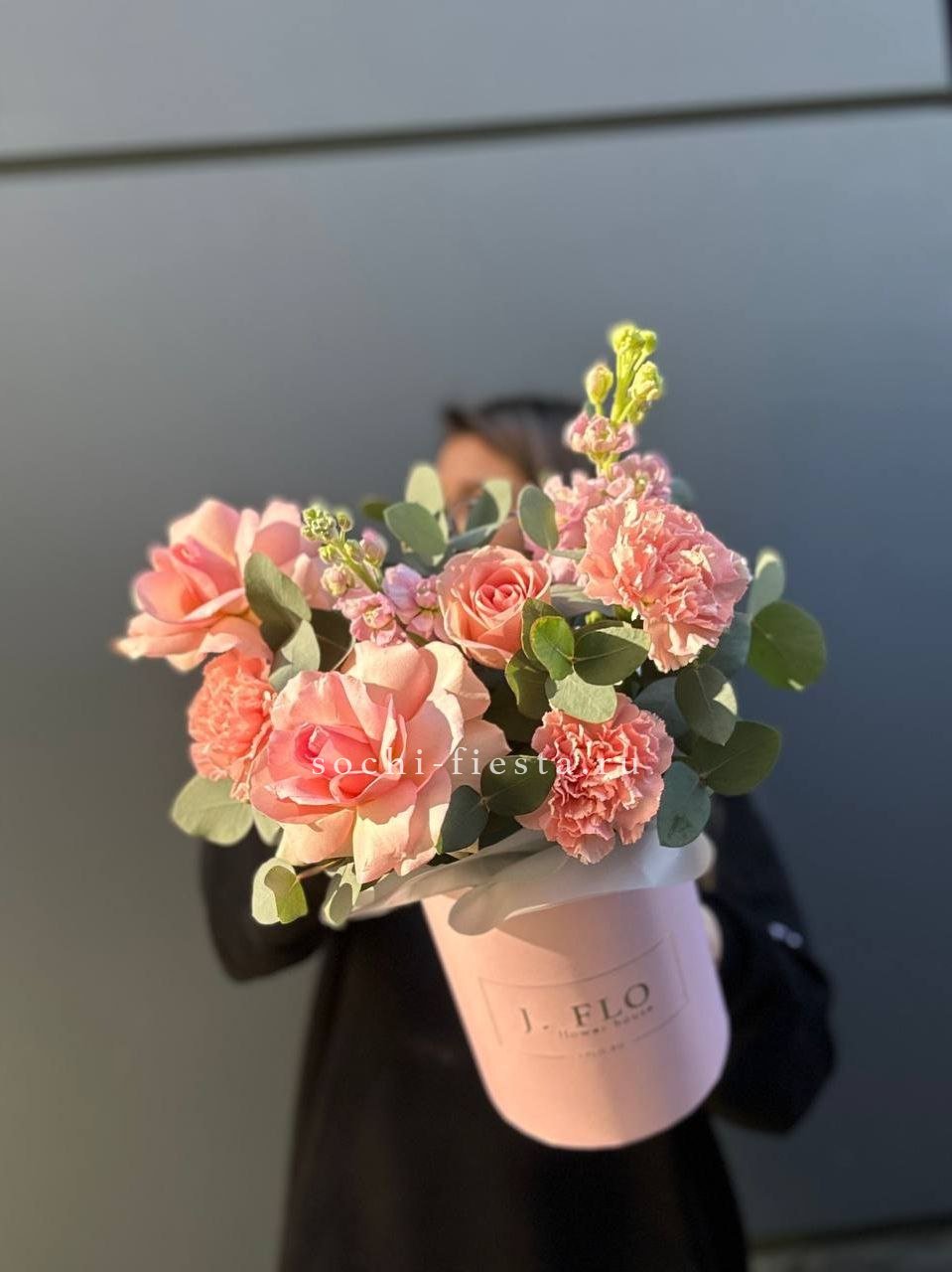 Пышная композиция в круглом боксе объединяет розы, эустому, хризантемы и диантус в плотную цветущую массу. Бомбастик добавляет объёма, а эвкалипт смягчает переходы между соцветиями. Готовое решение для размещения на столе или комоде.