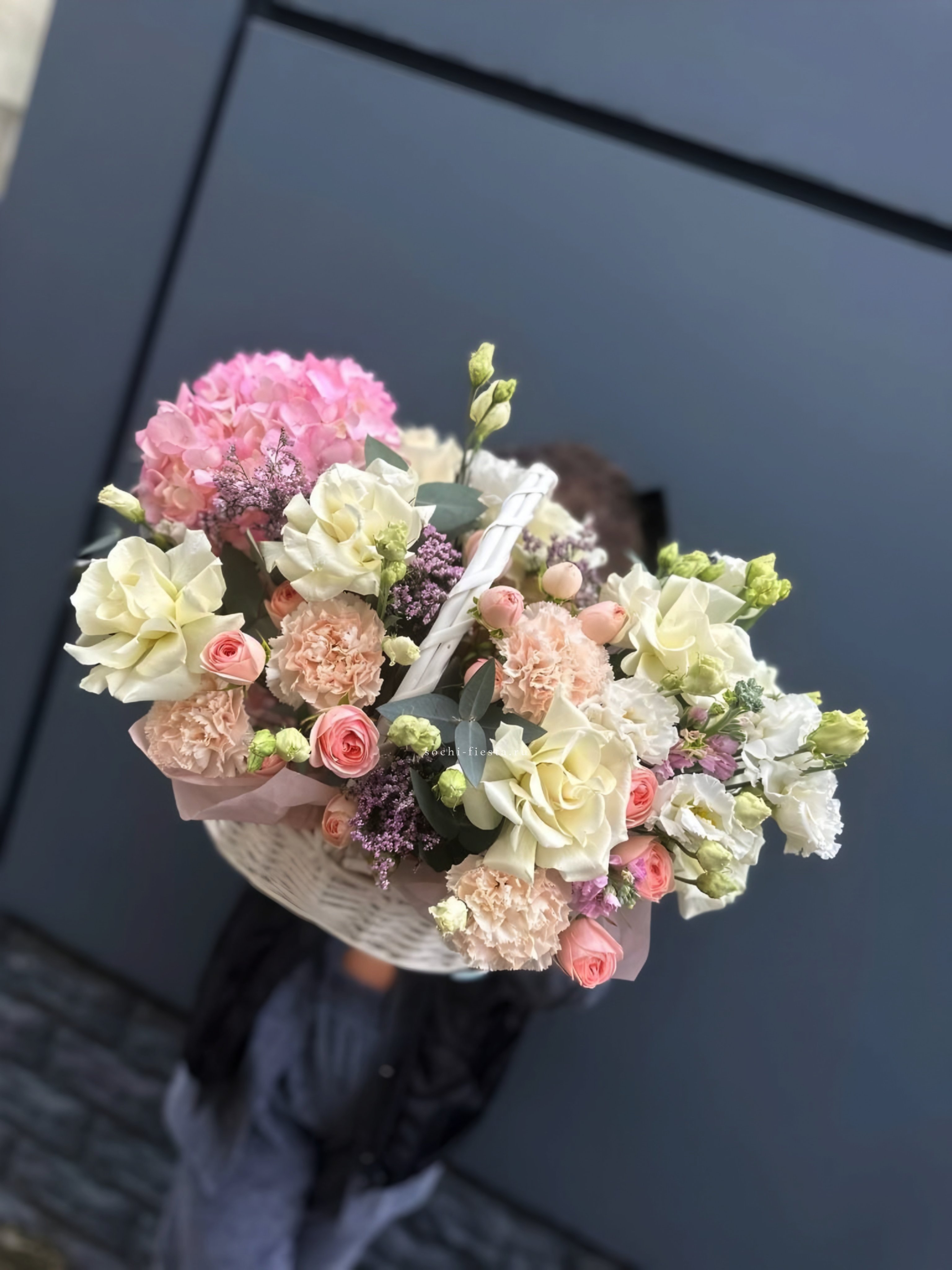 Розовые тона переплетаются с белыми вкраплениями гортензии. Кустовые розы и маттиола дополняют объемную композицию свежими акцентами.