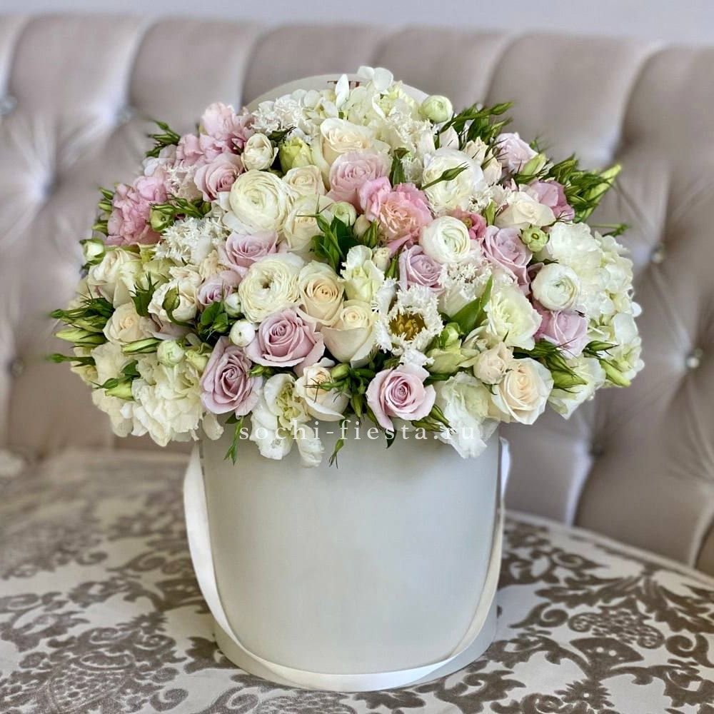 гортензия - 11 шт., пионовидная кустовая роза Мисти Баблс 7 шт., лента, дизайнерская упаковка.