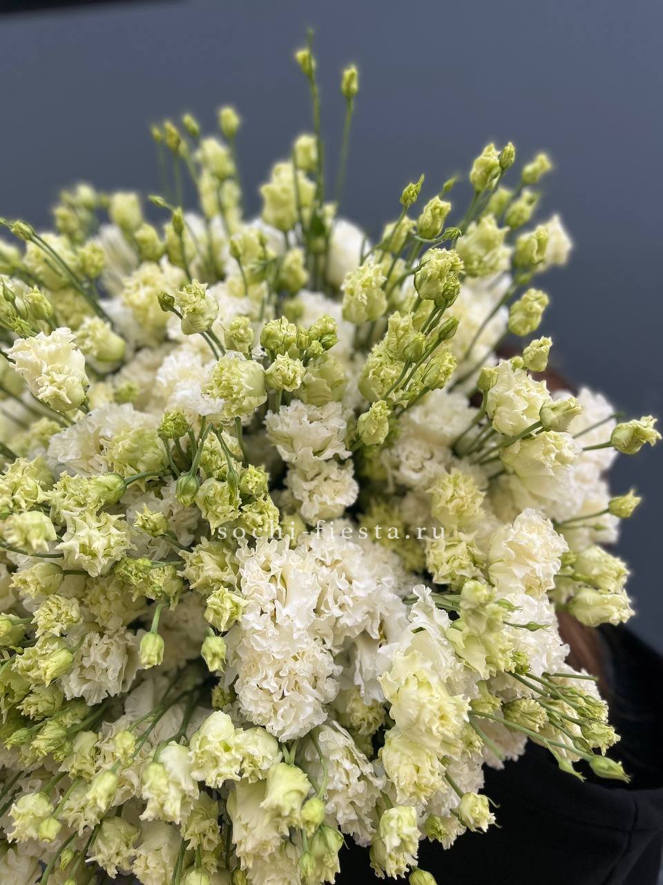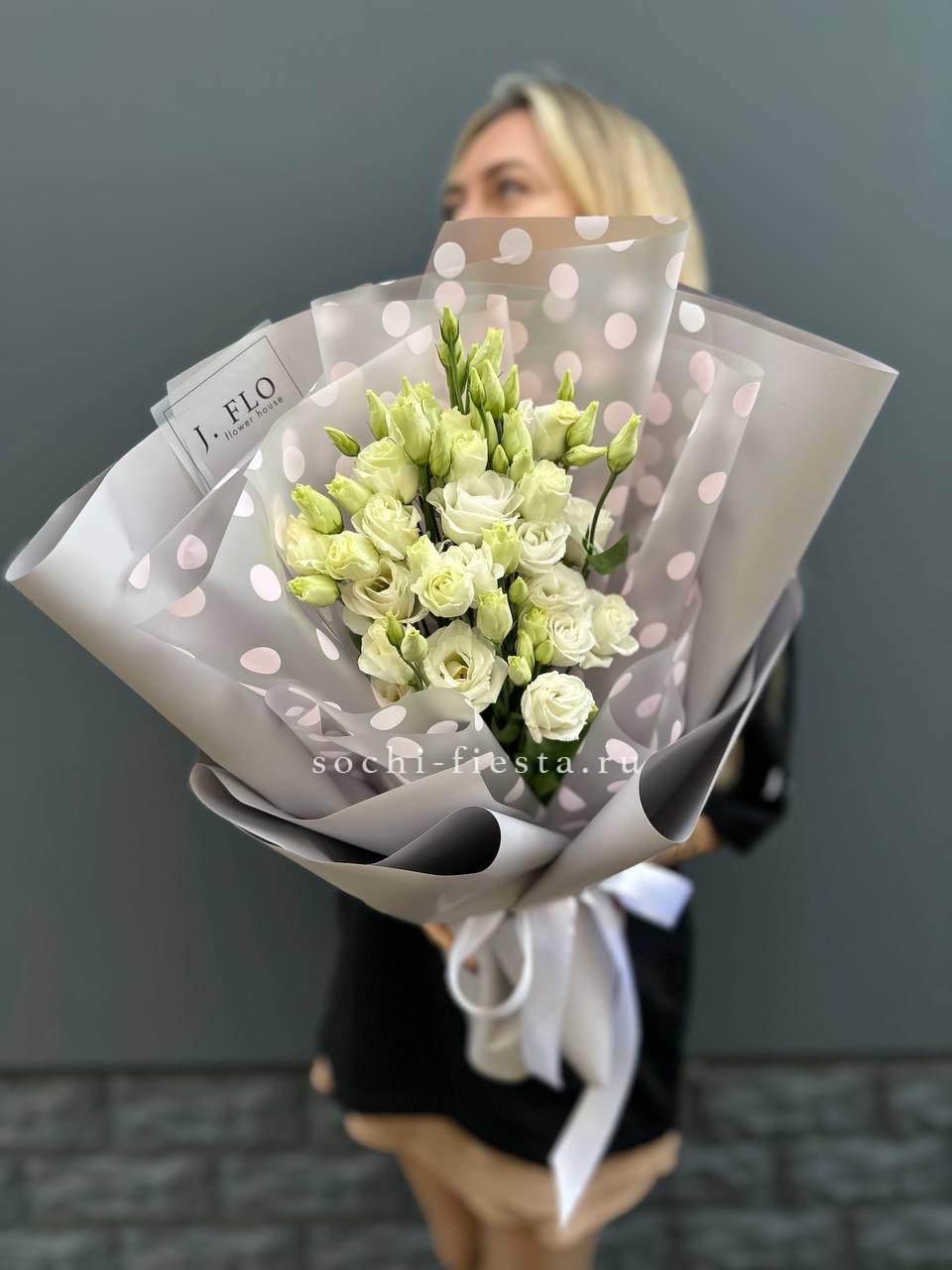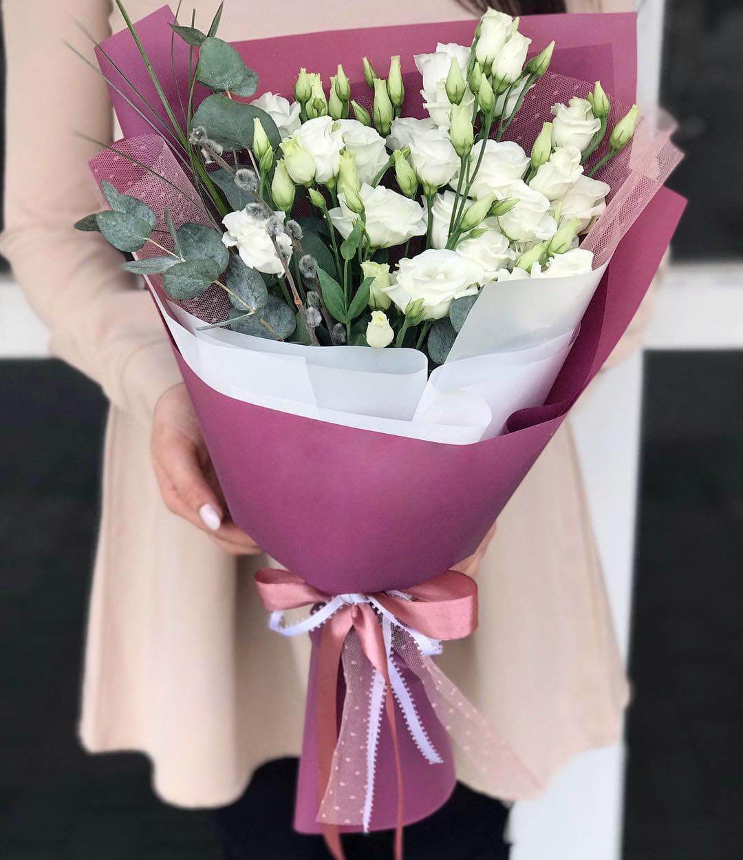 эустома - 5 шт., эвкалипт, лента, дизайнерская упаковка.