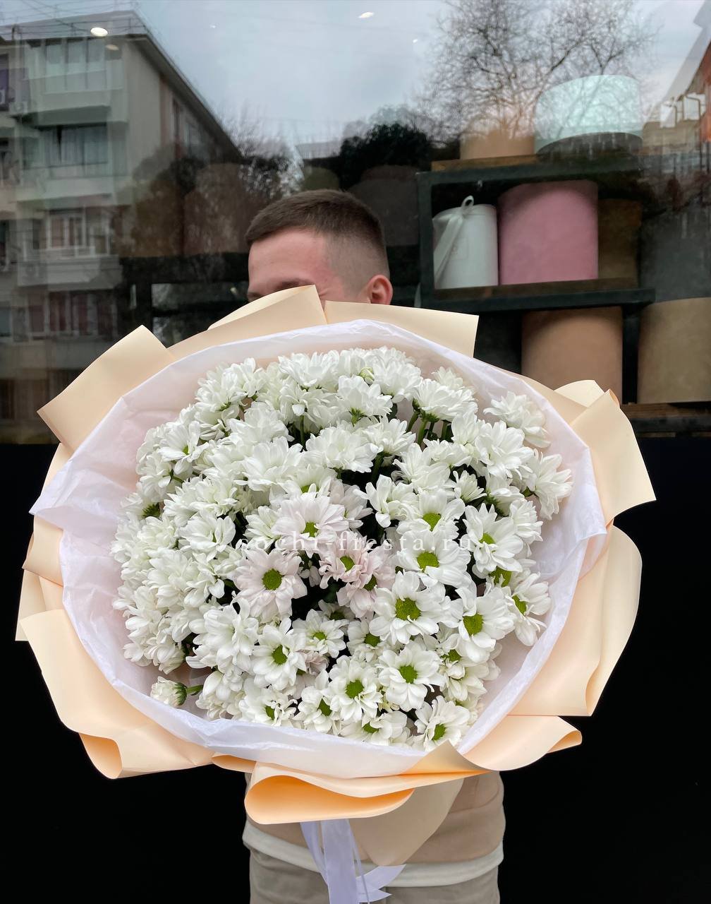 Семь веток кустовой хризантемы обрамлены лавандовым фоамираном, который мягко перекликается с оттенками бутонов. Композиция собрана свободно, сохраняя естественную пластику стеблей и живость форм.