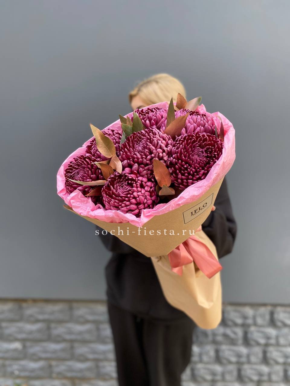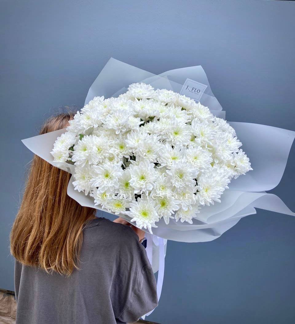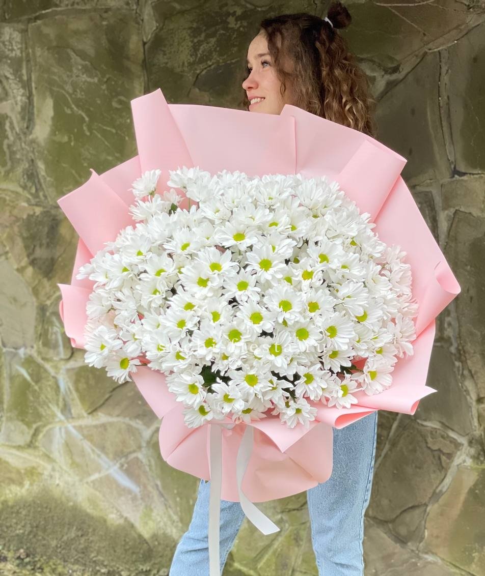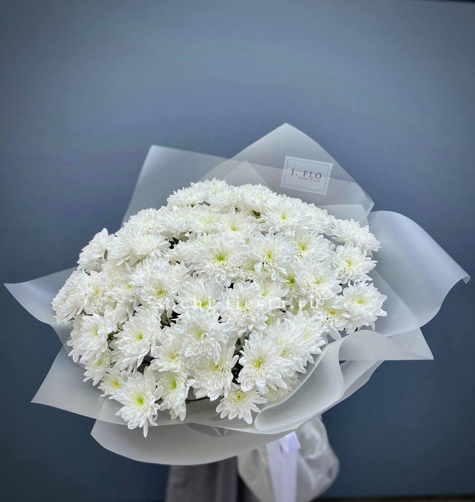 Семь пышных соцветий хризантемы с игривыми завитыми лепестками собраны в плотную композицию. Золотистый эвкалипт добавляет теплое мерцание и завершает образ. Яркий жест для тех, кто любит выразительные формы и живую энергию цветов.