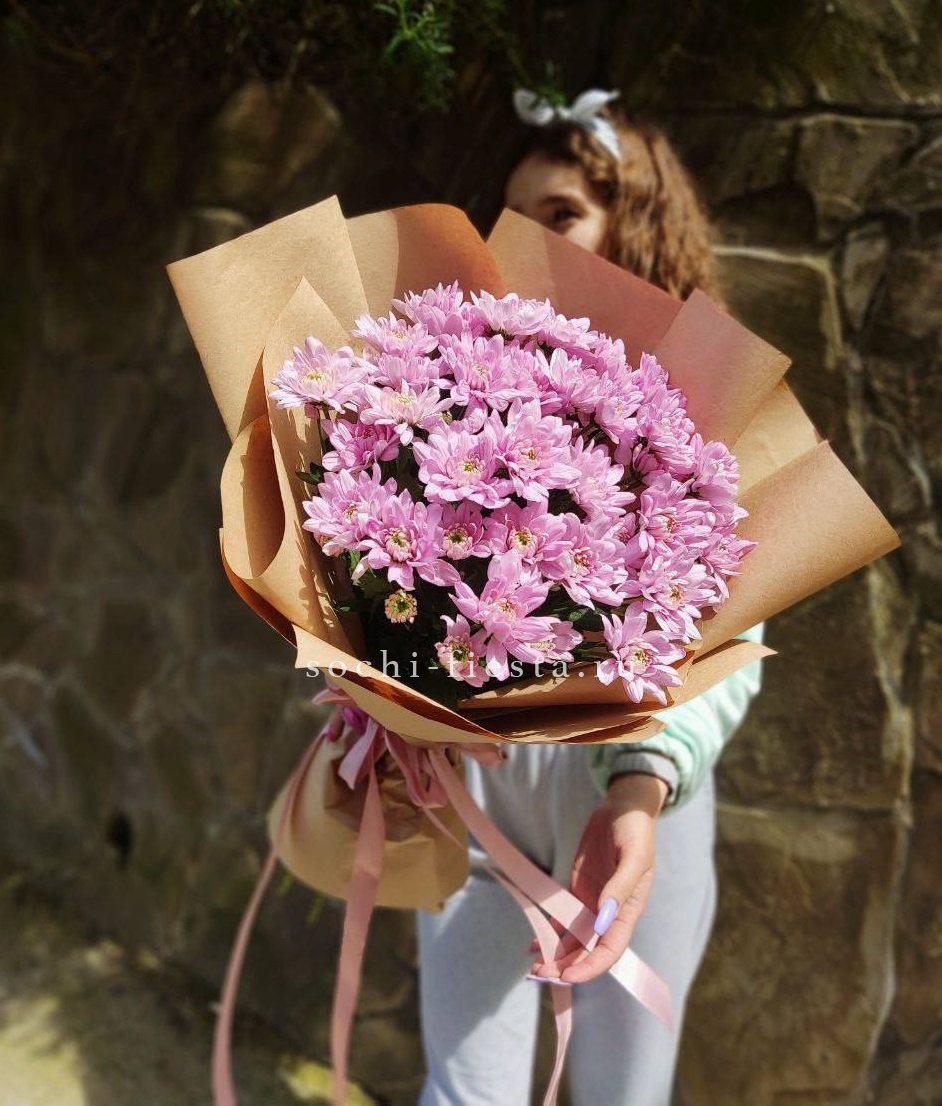9-11 веток хризантем сантини, лента, дизайнерская упаковка.