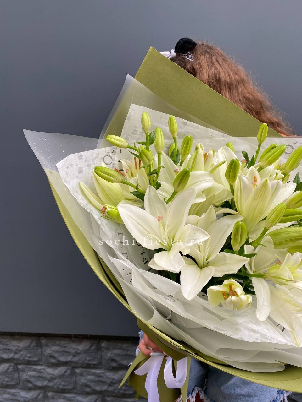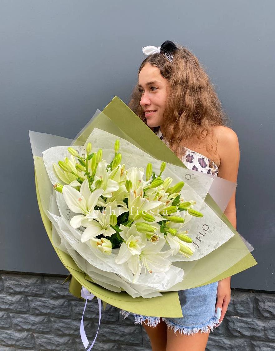 Пионовидные лилии с махровыми бутонами дополнены воздушным лимониумом. Девять стеблов образуют пышную форму, где каждый цветок раскрывается слоями.