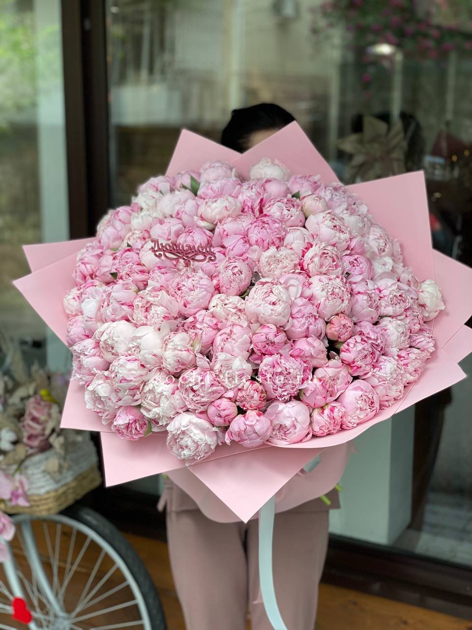 101 пион Сара бернар, топпер Любимой; (можно на выбор), лента, дизайнерская упаковка.