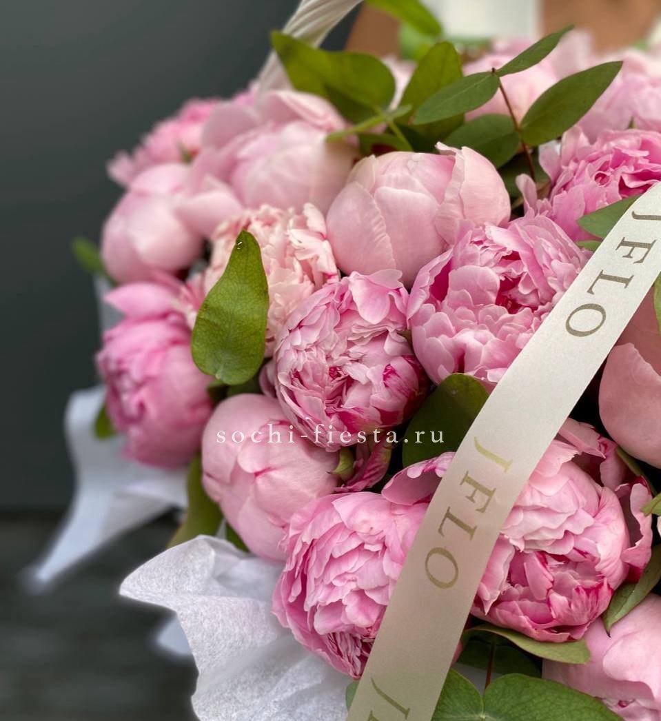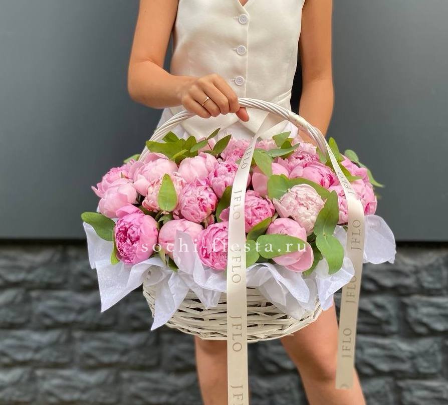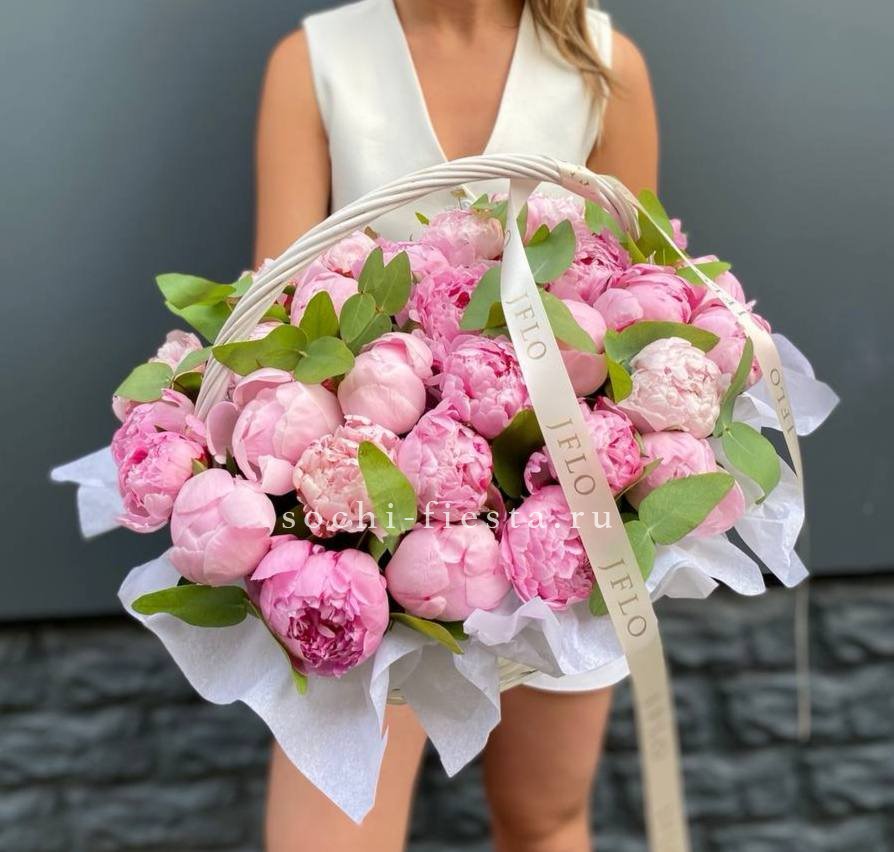 Двадцать девять пионов с ветками эвкалипта собраны в классическую корзину. Бутоны разной степени раскрытия формируют воздушный купол, который сохраняет свежесть и аккуратный силуэт несколько дней.
