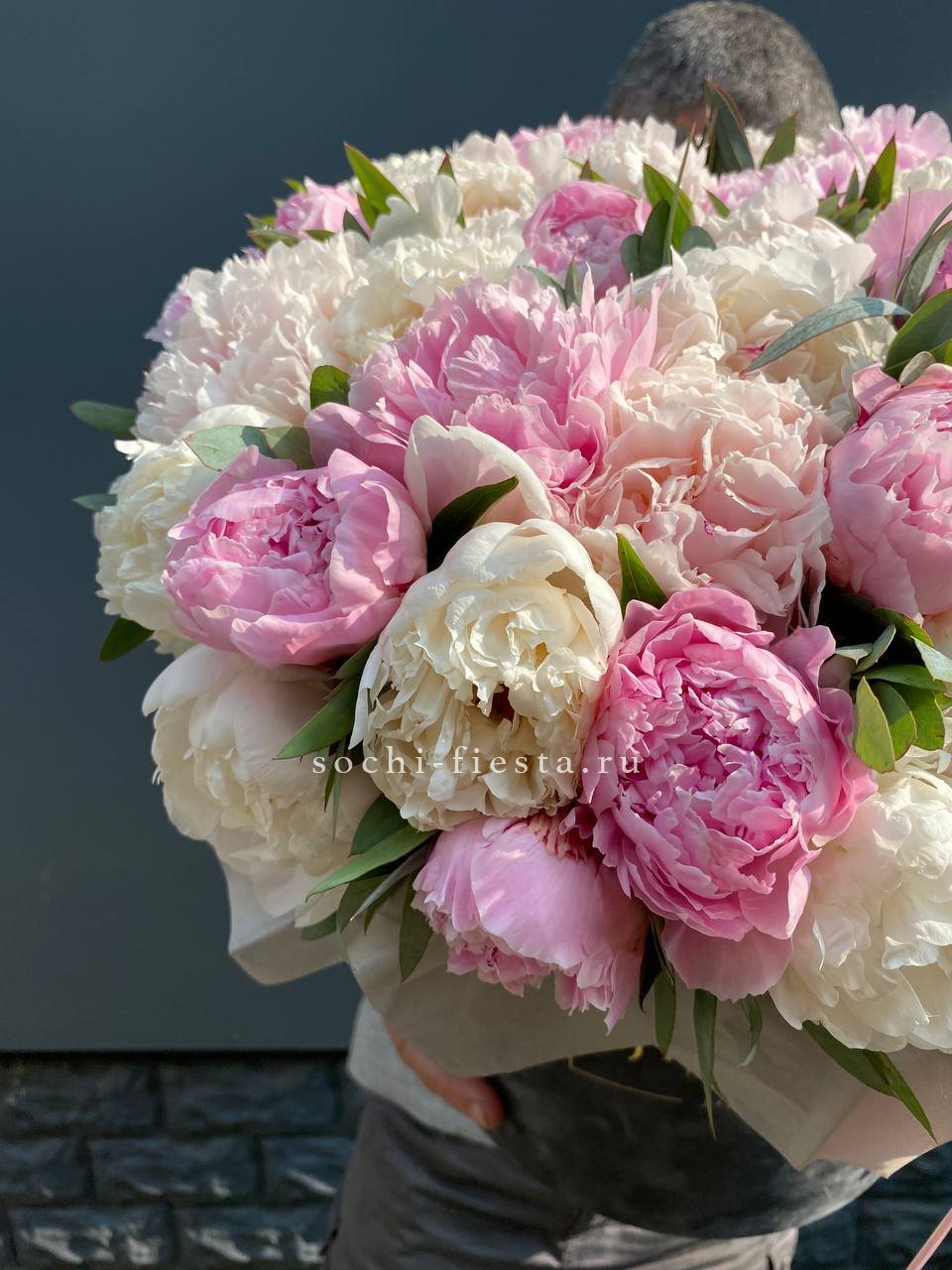 Пятьдесят один пион в бархатном боксе создаёт впечатляющий объём и наполняет пространство. Плотная укладка бутонов формирует цветочное полотно с глубиной и текстурой.