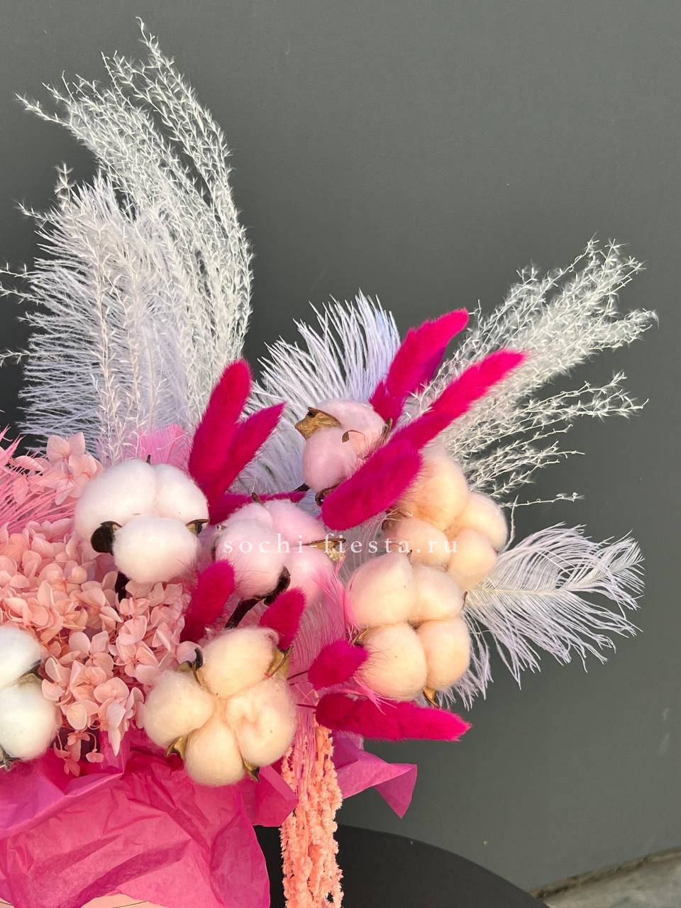 Бокс с природными текстурами: мягкость хлопка, воздушность лагуруса и графичность амаранта. Перья добавляют легкости. Композиция держит форму и не теряет выразительности со временем.