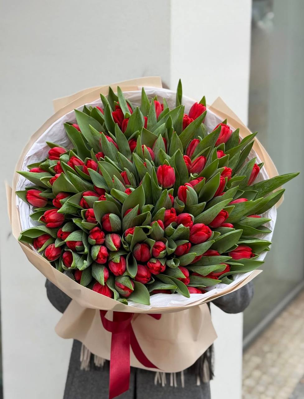 Сто один белоснежный бутон собран в монохромную композицию впечатляющего объема. Плотная сборка создает графичный силуэт, который заполняет пространство светом и весенней свежестью.