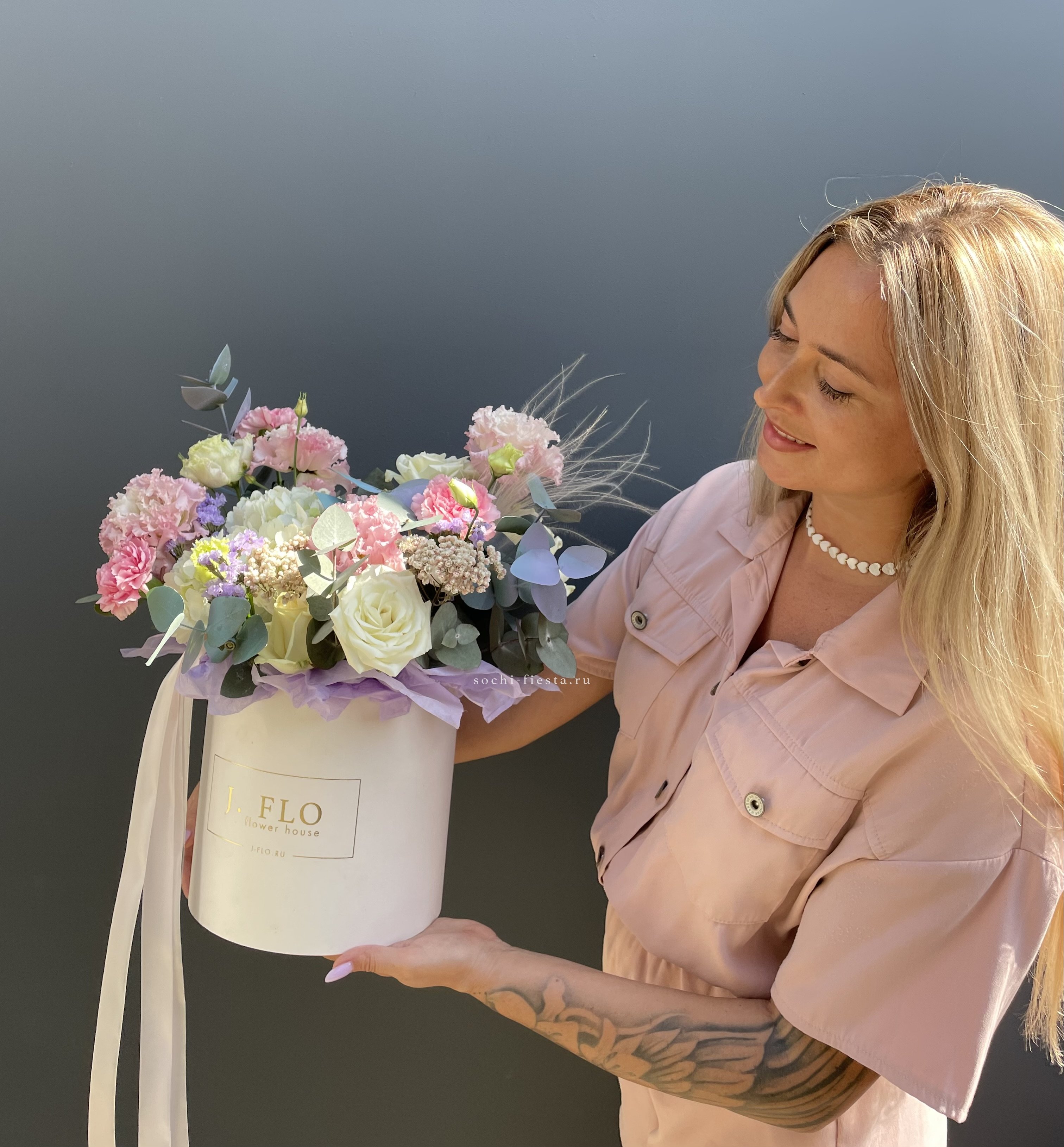 гортензия, розы одноголовые, кустовые розы, вероника (аналог вне сезона), маттиола (аналог вне сезона), эвкалипт, лента, дизайнерская упаковка.