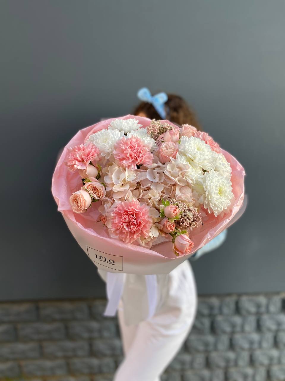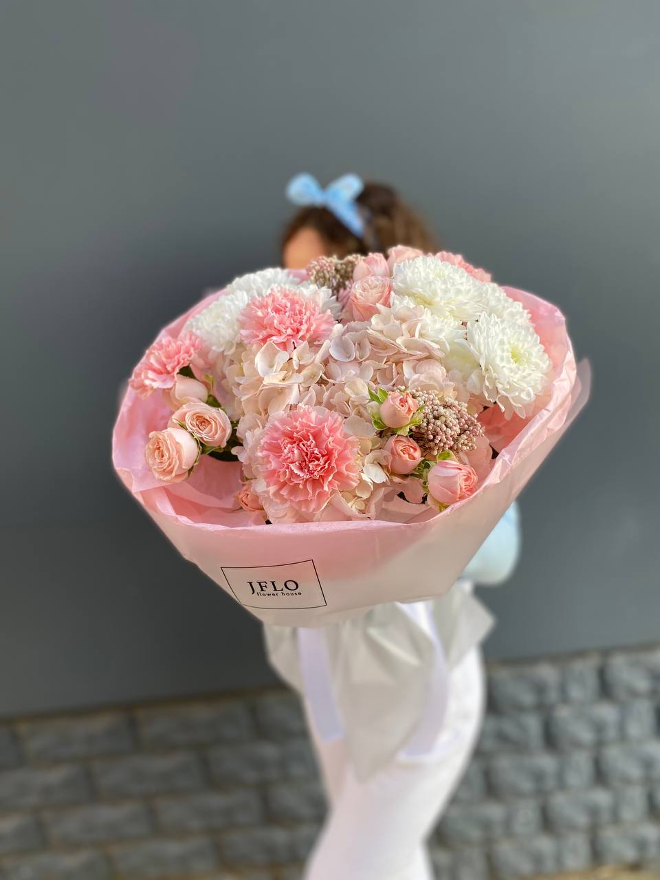 Сочетание вывернутых роз с гортензией, диантусами, розами, бомбастиками создает воздушных элегантный образ идеального цветочного подарка