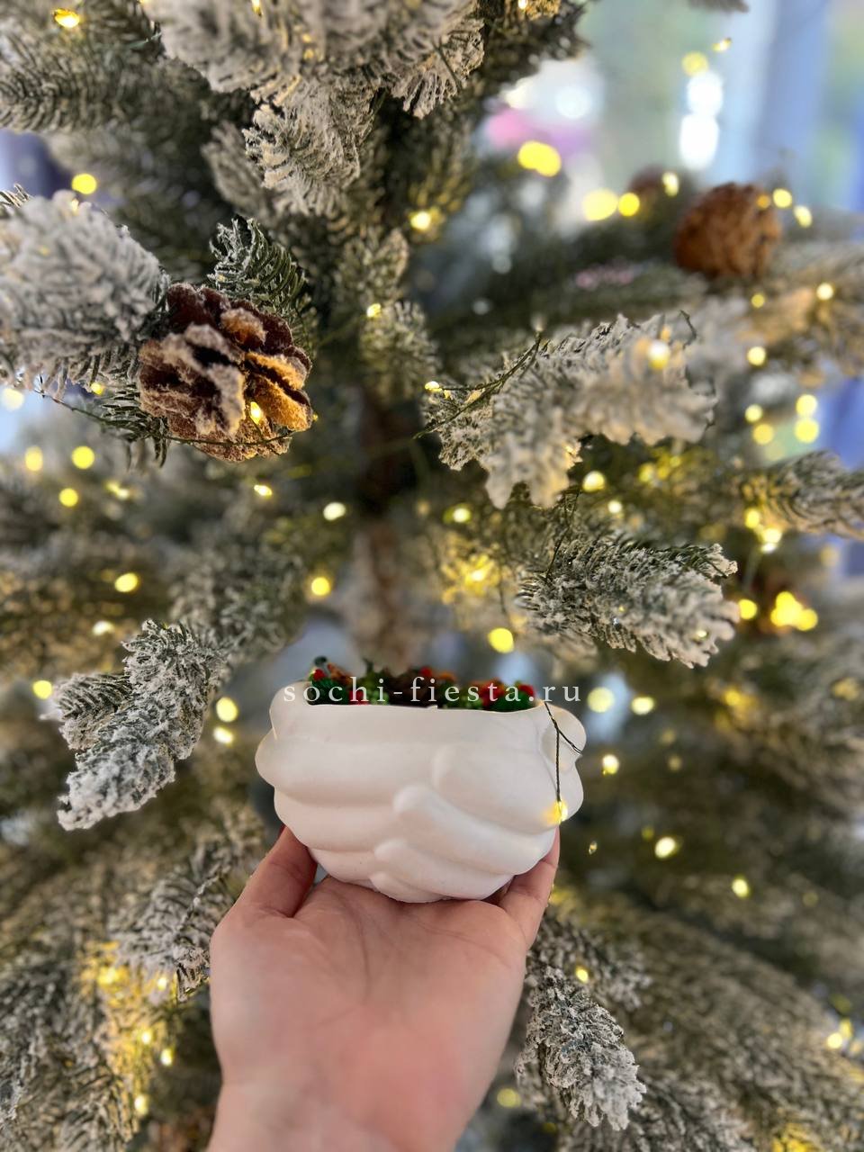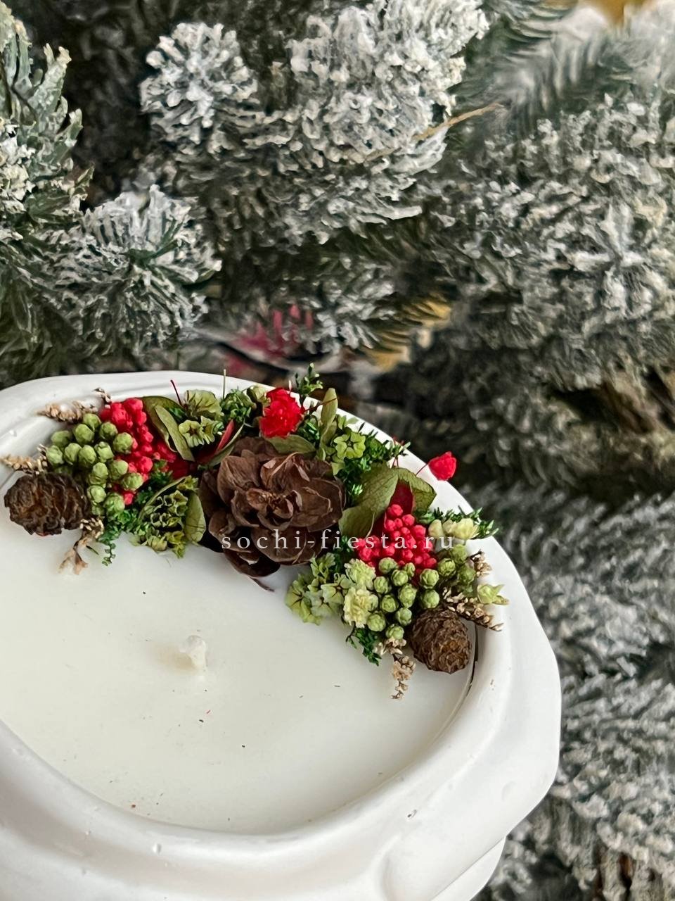 Руки бережно держат шишку — скульптурная форма из гипса с кокосовым воском внутри. Ароматы бузины или мангостина раскрываются мягко и наполняют пространство теплом.