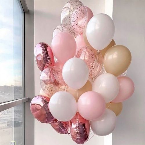 6 шт. шаров с наполнением "Confetti", 15 шт. хромированных шаров, грузик. Все шары мы предварительно обрабатываем специальным составом Highfloat, обеспечивая им длительный срок полета.