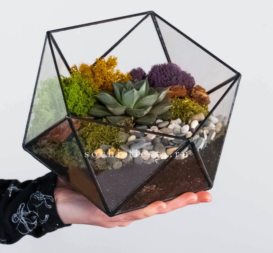 флорариум в кашпо Икосаэдр идеален для подарка искушенным и практичным личностям. Растение неприхотливо в уходе, композиция стильно смотрится в любом пространстве:)