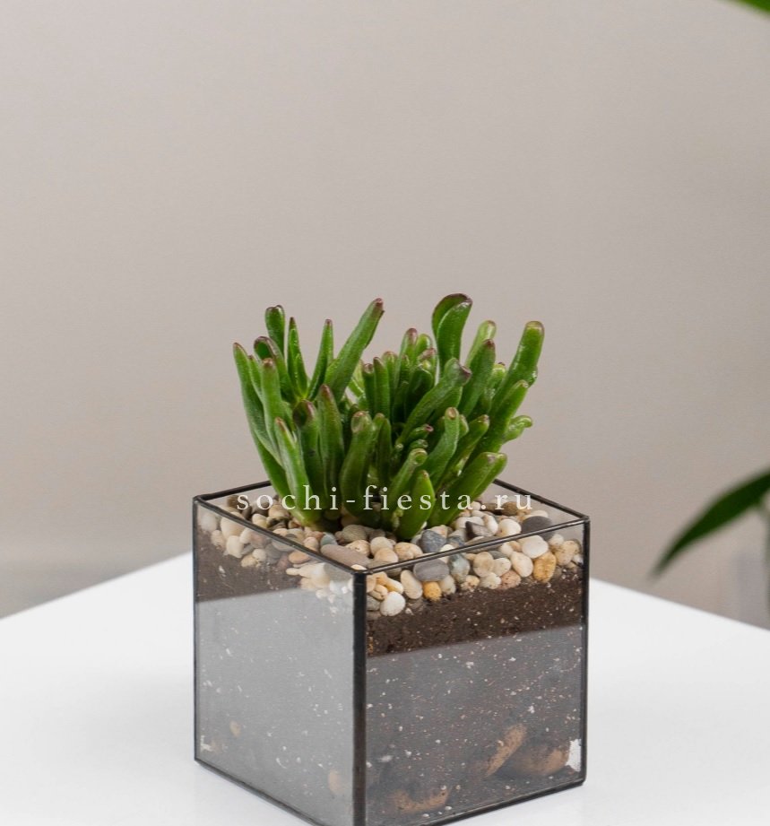 Компактный стеклянный куб с суккулентом Хоббит помещается на рабочем столе или полке. Миниатюрная композиция не занимает много места и живет без частого ухода.