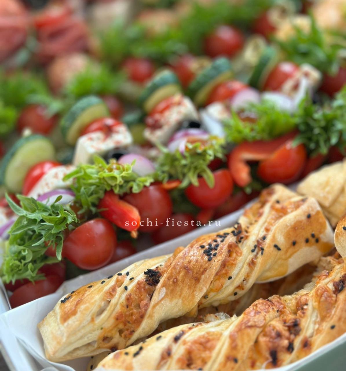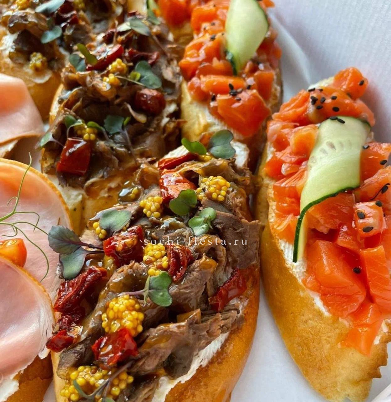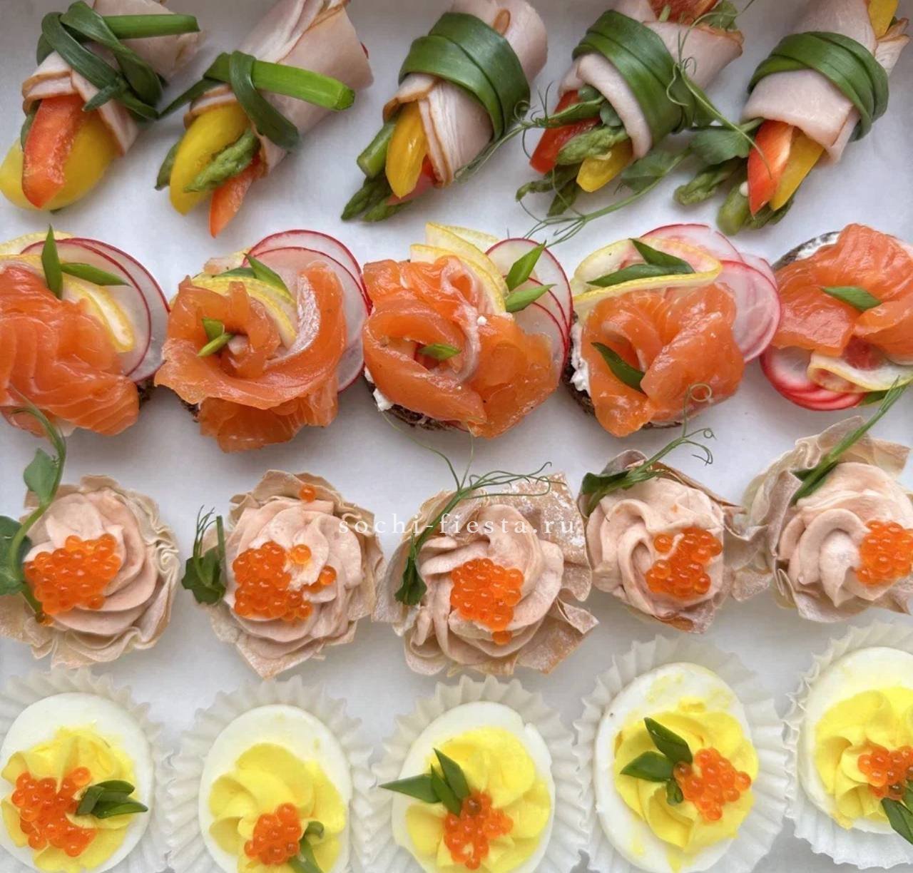 72 закуски. Ассорти мини-канапе закусочных — 32 шт. Картофель бейби в грудинке с корнишоном и черри- 10 шт. Салаты на шпажке: Греческий- 10шт. Цезарь с креветками— 10шт. Закуска к пиву хрустящая из слоеного теста с сыром и специями- 10шт.
