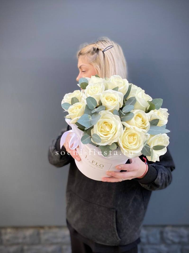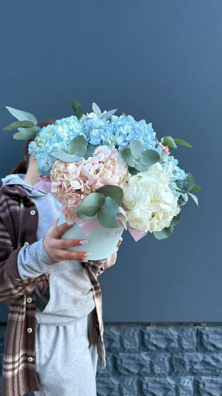 разноцветные гортензии с эвкалиптом в коробочке.