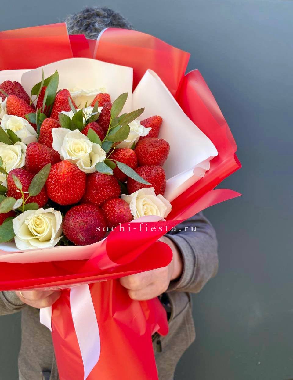 300-400г. ароматной клубники, кустовая роза, эвкалипт, лента, дизайнерская бумага.