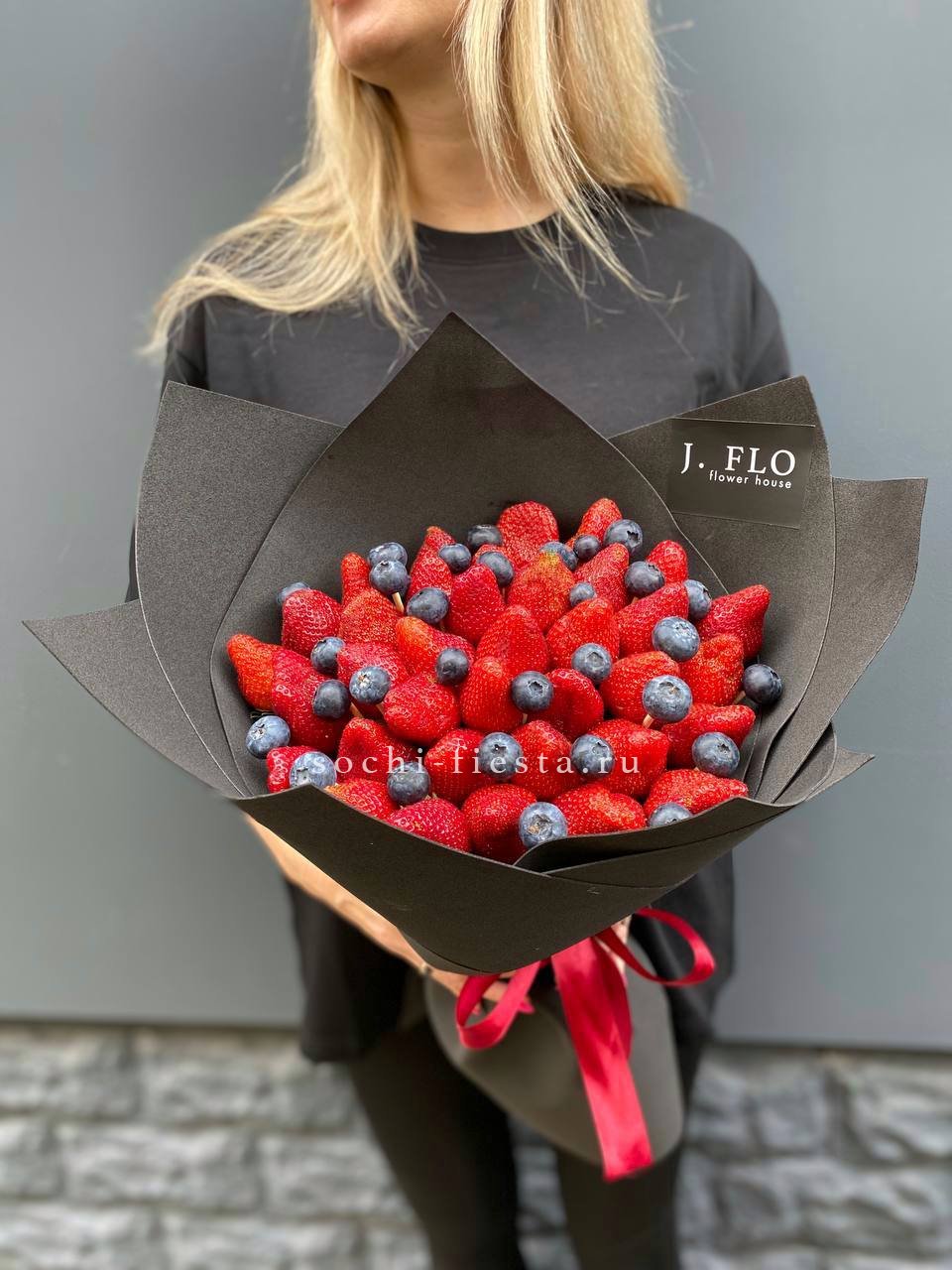 1000 г. ароматной клубники, 200 г. голубики, лента, оформление.