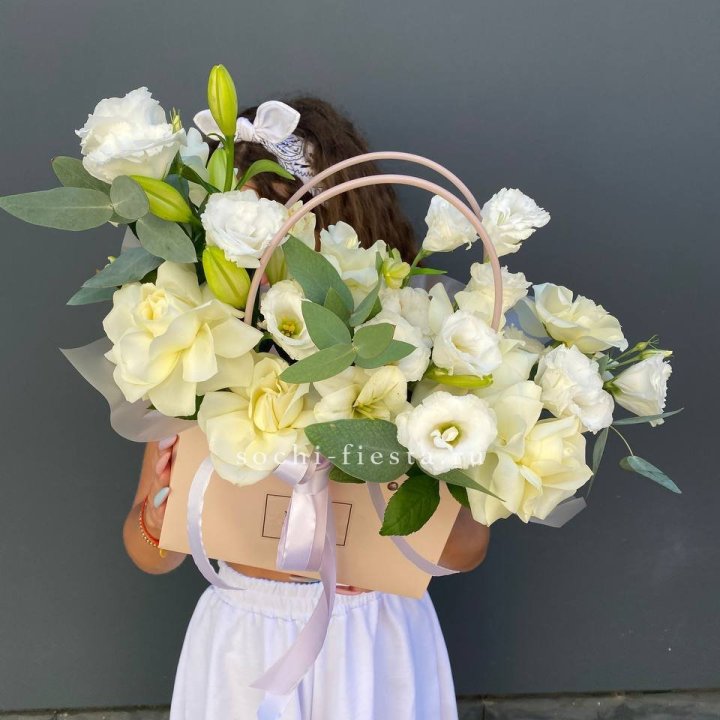 Наполнение подбирается под сезон. Зимой — амариллис, розы, ранункулюсы. Весной — тюльпаны, ранункулюсы, фрезия. Летом — пионы в мае-июне, гортензия в июле-августе. Осенью — хризантемы и декоративные травы.