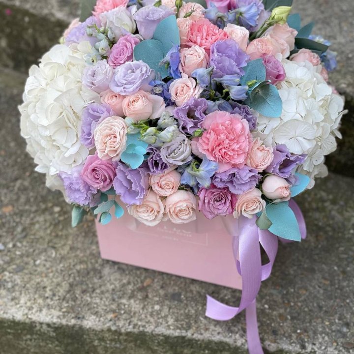 Наполнение подбирается под сезон. Зимой — амариллис, розы, ранункулюсы. Весной — тюльпаны, ранункулюсы, фрезия. Летом — пионы в мае-июне, гортензия в июле-августе. Осенью — хризантемы и декоративные травы.