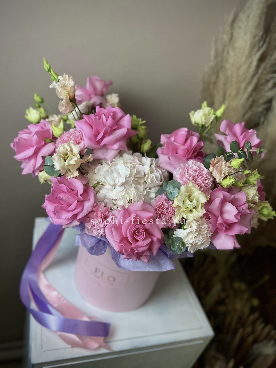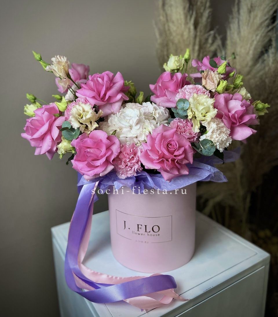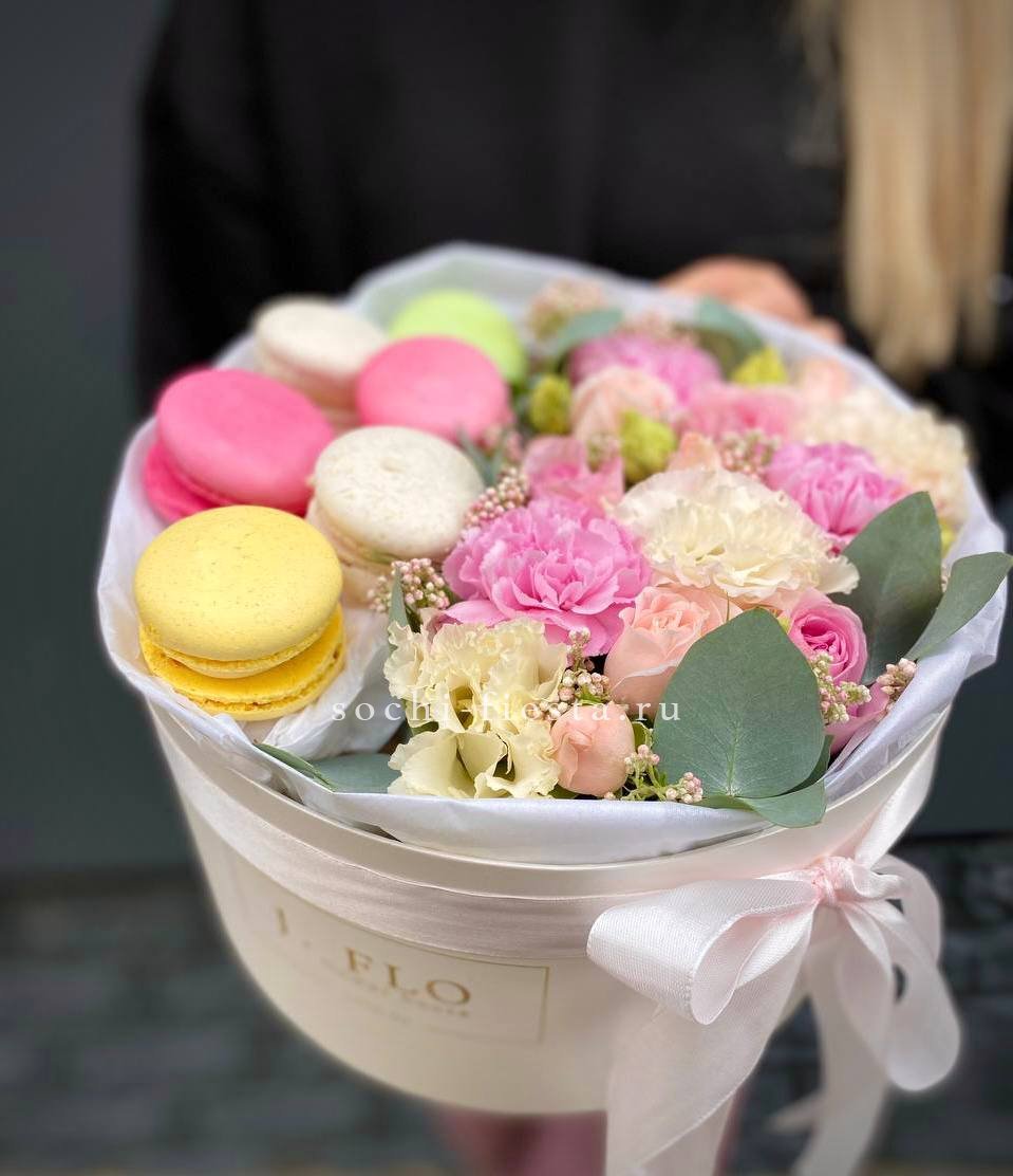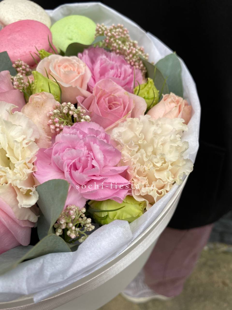 Эустомы и пионовидные розы соседствуют с французскими макарон в коробке в форме сердца. Диантусы и эвкалипт создают объём, а сладкий акцент делает композицию завершённой.