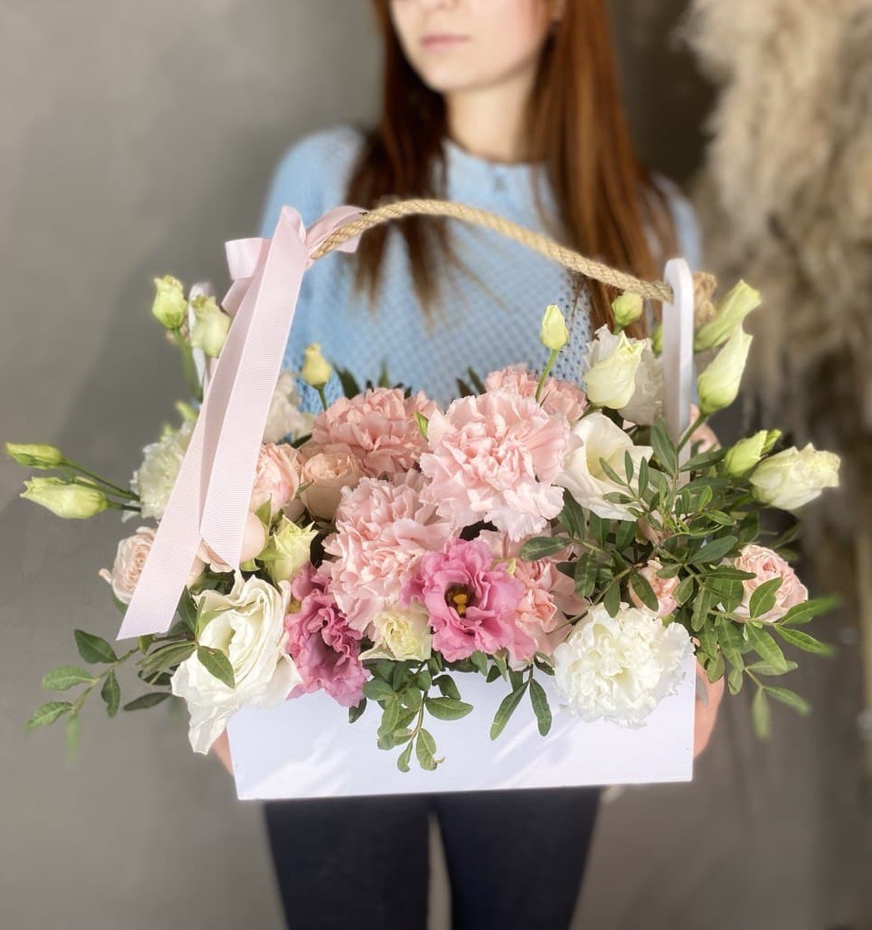 Яркие головки диантусов и пышная эустома создают живую композицию в деревянном ящике. Розы добавляют объём и насыщенность цвета. Формат с колбами сохраняет свежесть надолго.
