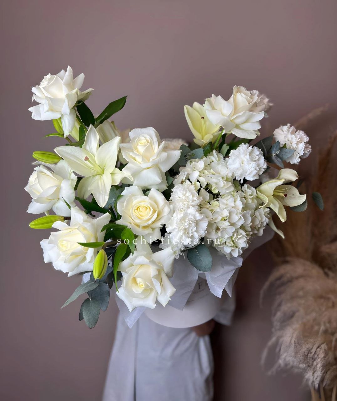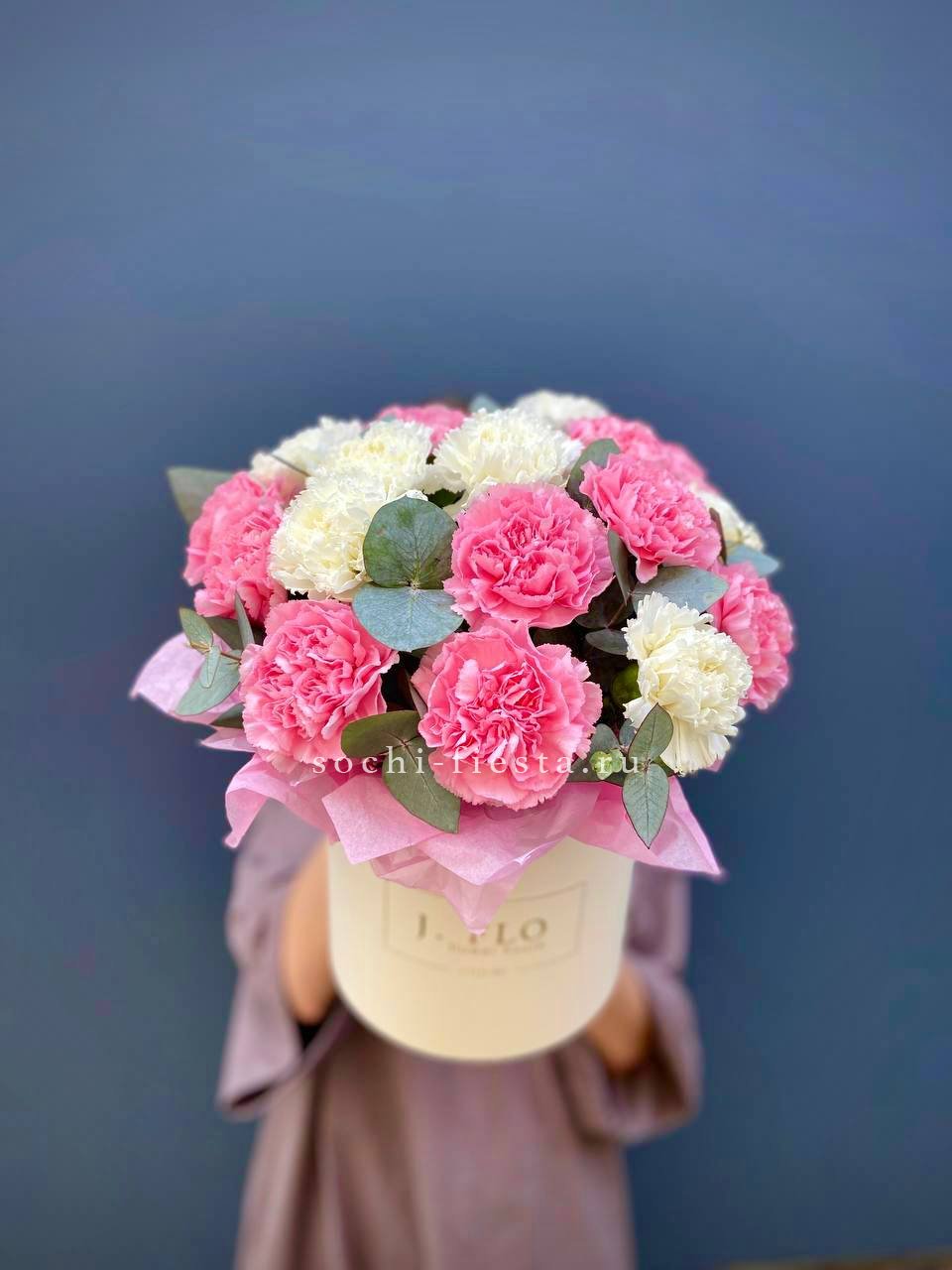 Двадцать семь бархатных роз собраны в плотную круглую композицию с серебристыми ветками эвкалипта. Шляпная коробка сохраняет свежесть и позволяет разместить цветы в любом уголке дома.