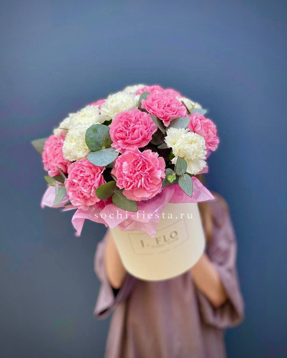 27 розовых роз в шляпной коробке с эвкалиптом.