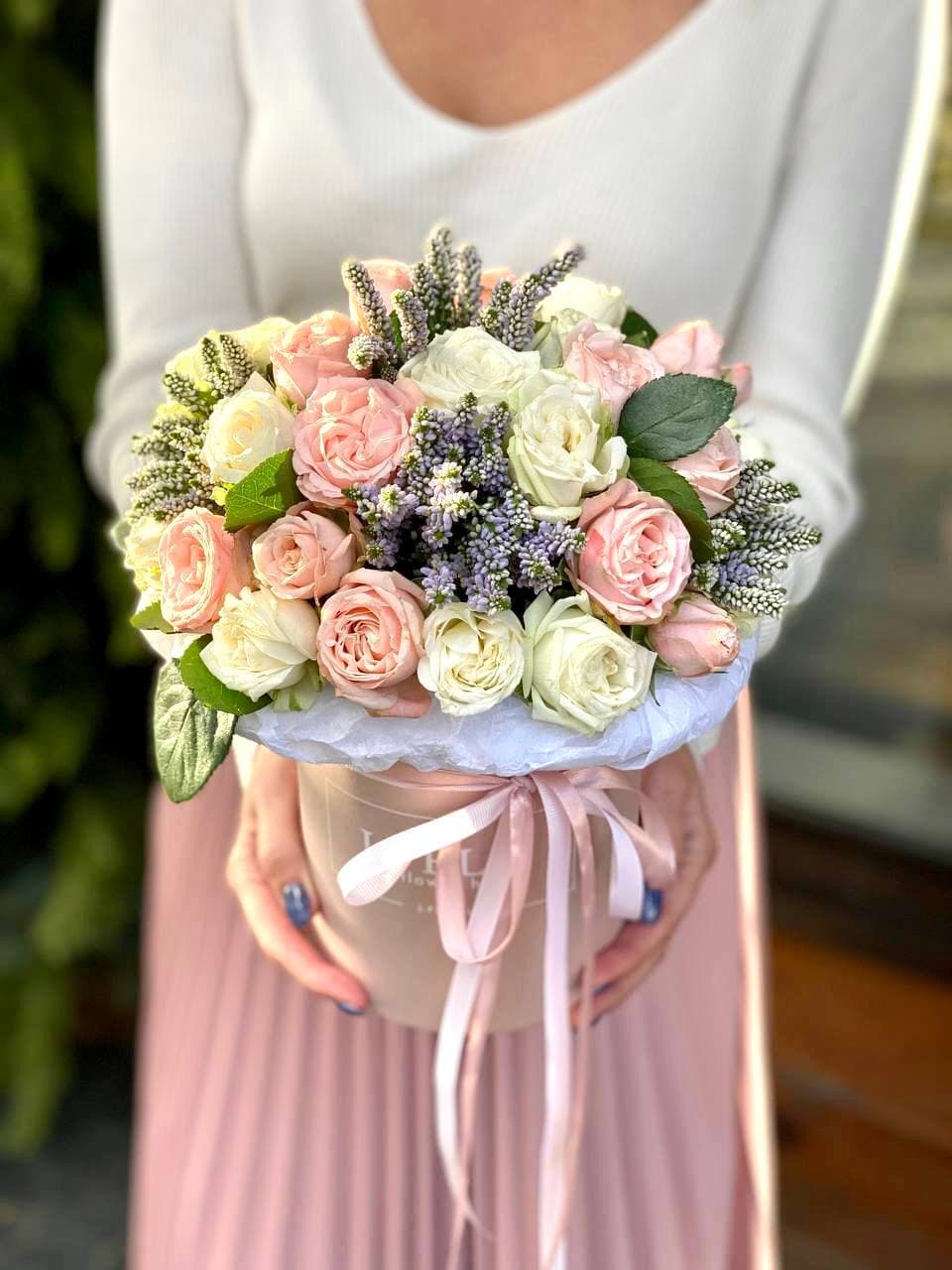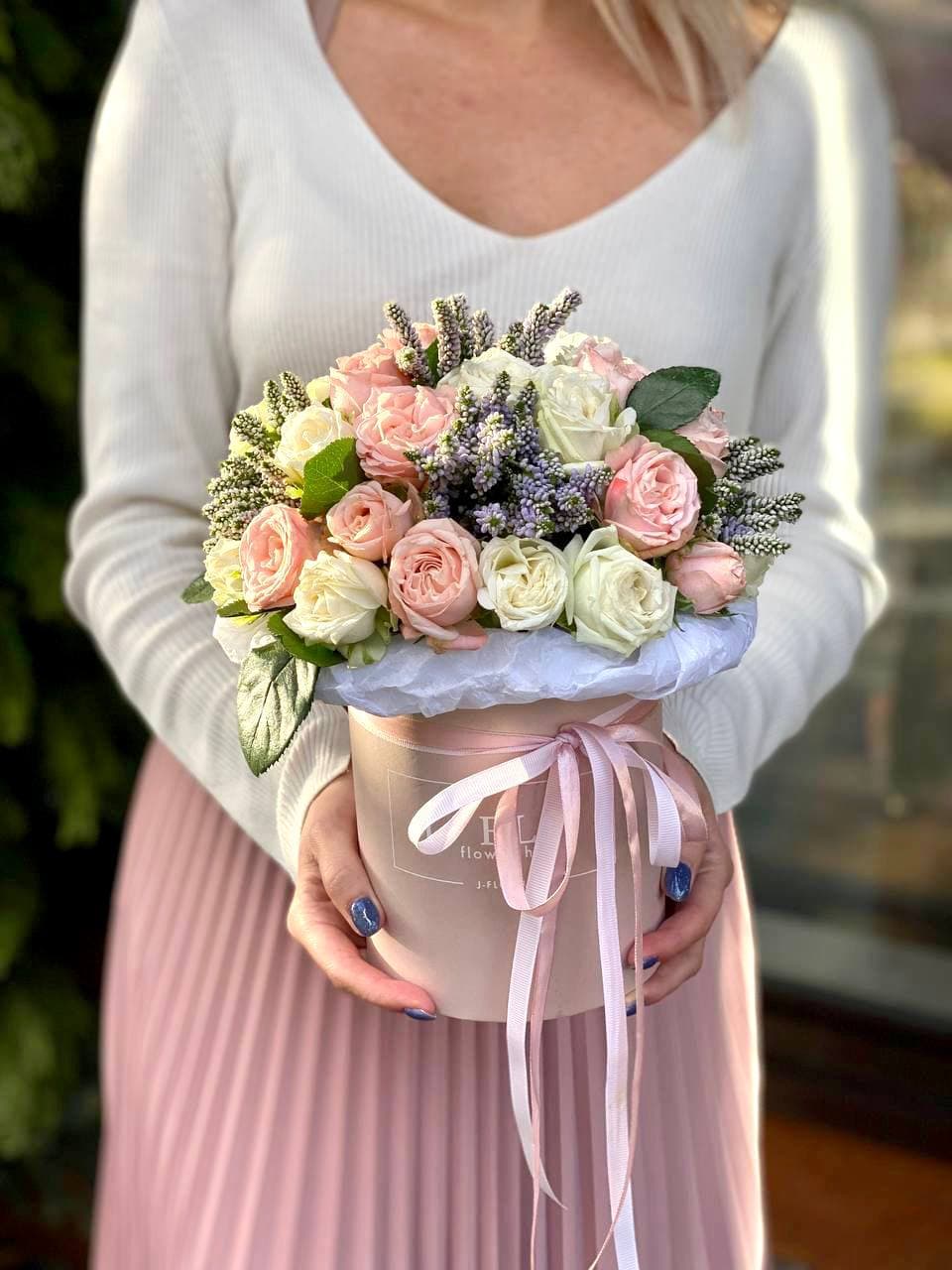 гортензии, эустома, розы, бомбастик, эвкалипт, антиринум в боксе 25.