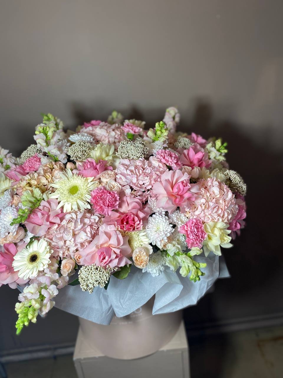 Гортензии формируют пышную базу, сквозь которую проступают бутоны роз и эустомы. Антиринум вытягивает силуэт вверх, а эвкалипт смягчает переходы между ярусами.