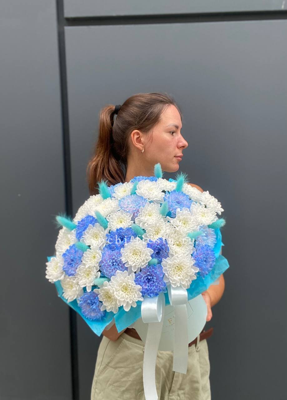 Композиция собрана из альстромерий, эустомы и хризантем с добавлением воздушного хлопка. Мягкие оттенки и разная фактура бутонов создают живописный объем. Дизайнерская упаковка завершает образ.