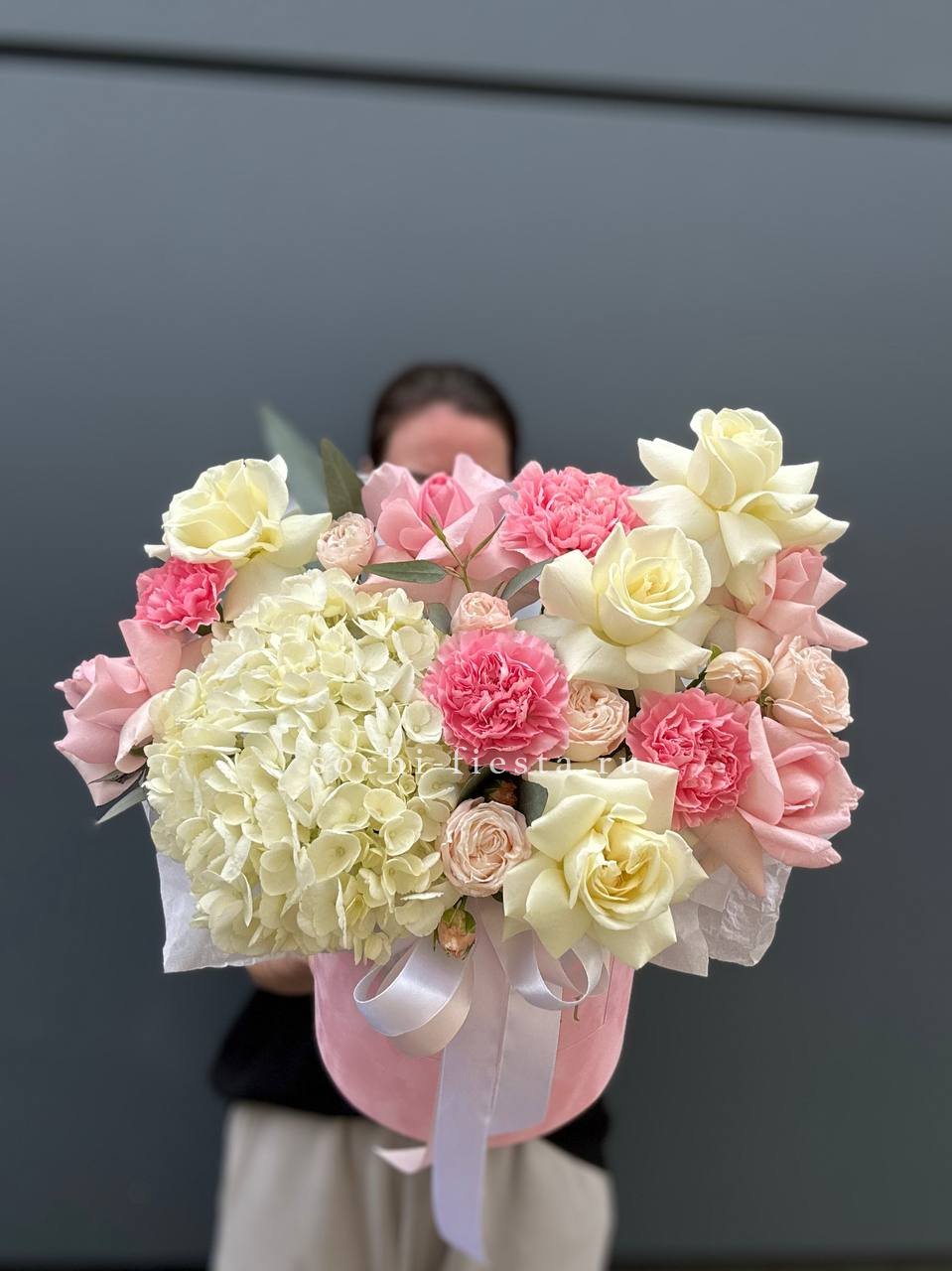 гортензия, одноголовые розы, пионовидные розы, диантусы, лента, цилиндр D20.