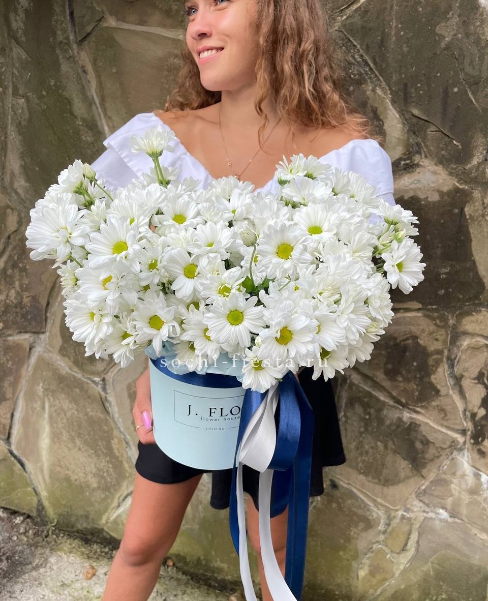 Хризантемы раскрыты полностью, каждый цветок виден отдельно. Коробка фиксирует стебли и позволяет поставить композицию на любую поверхность без вазы. Компактное решение для дома или офиса.