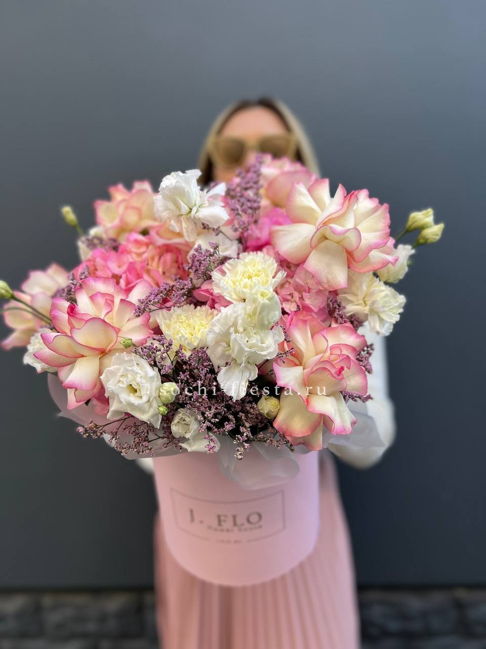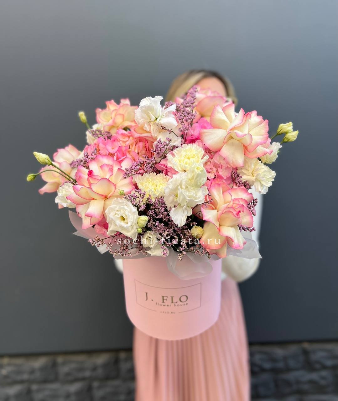 Розовая палитра переходит от французских роз к кустовым Джульетта с добавлением хлопка. Композиция в цилиндре сочетает воздушность и плотность фактур.