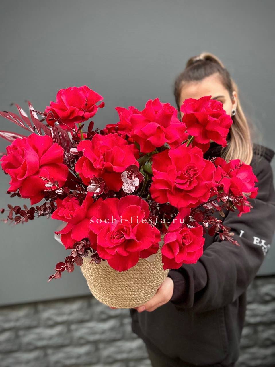 роза французская, эвкалипт, лист Чико (аналог), джутовое кашпо, оазис.