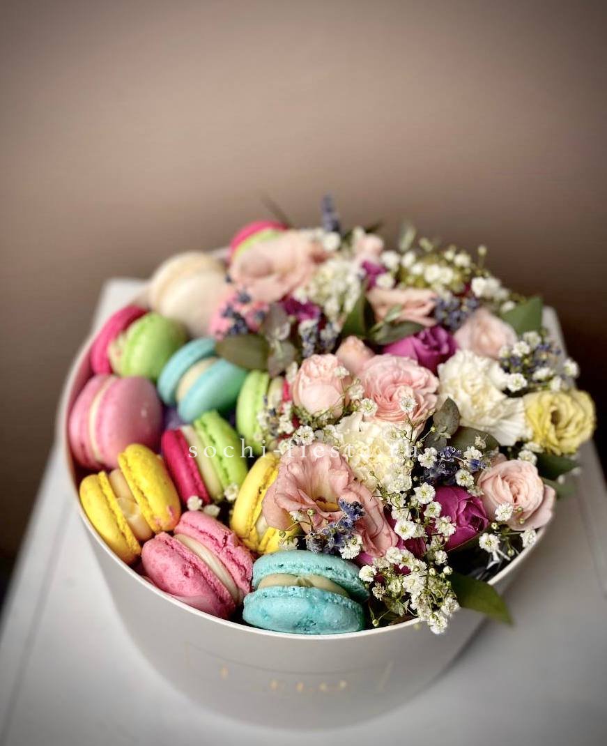 розы, диантусы в нежных оттенках, розовая круглая коробка D20, 6 макаронс.