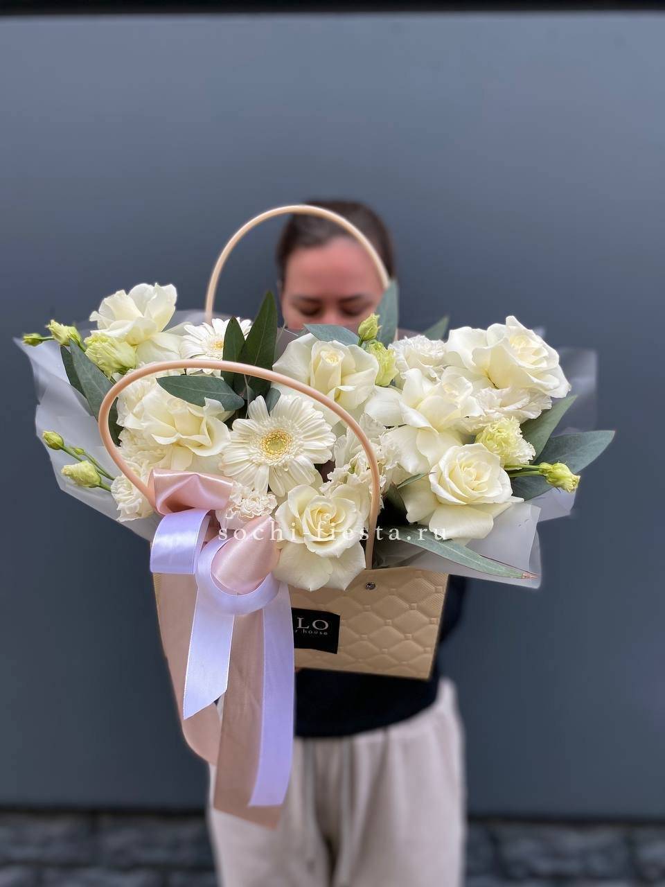 Хризантемы с пушистыми коробочками хлопка создают теплую домашнюю композицию в удобной сумочке. Цветы долго радуют взгляд и не требуют сложного ухода. Формат подходит для размещения в любом уголке дома.