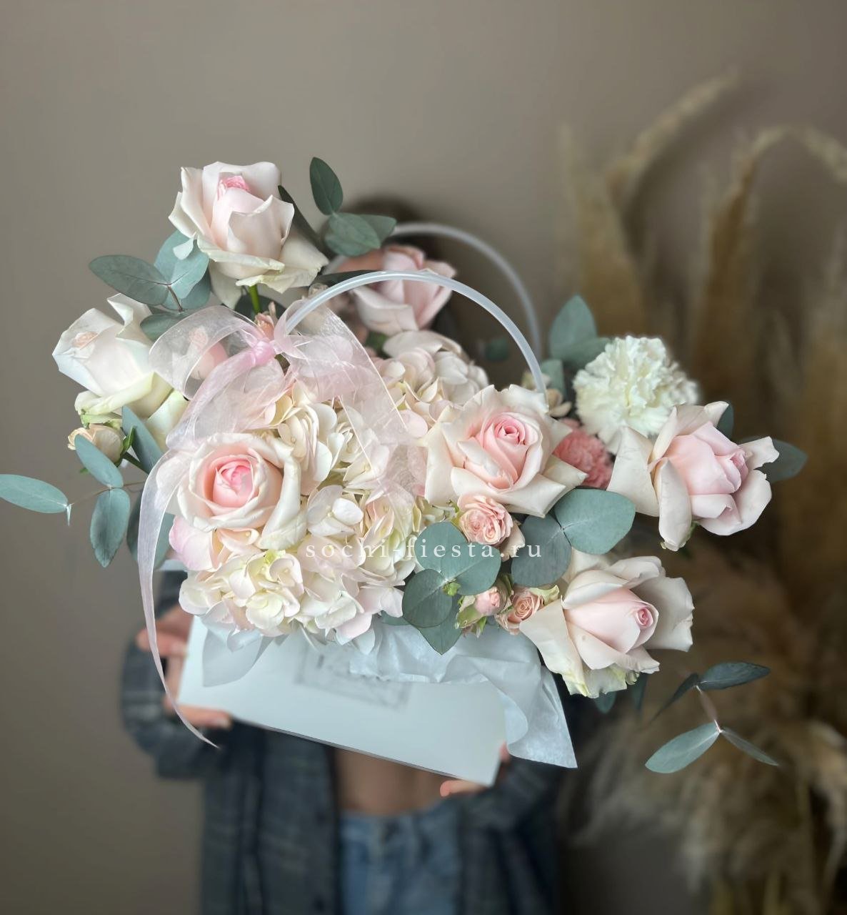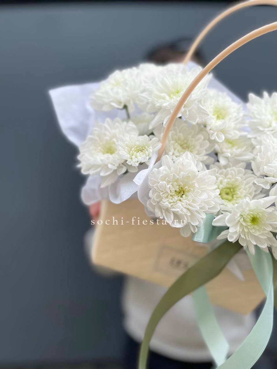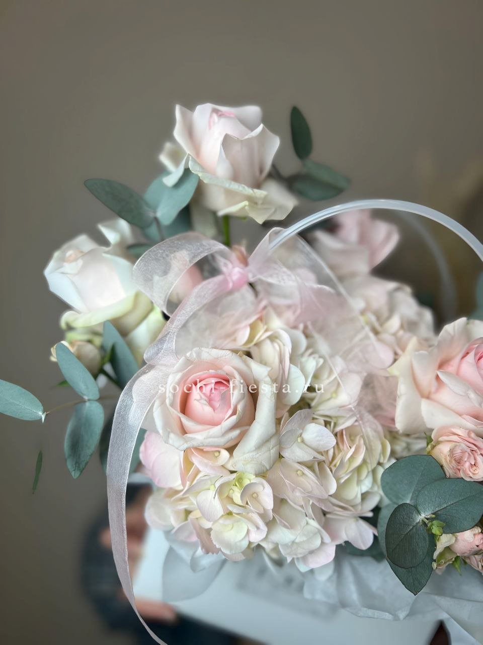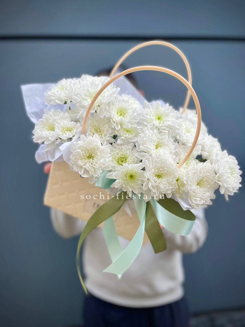Белые розы и хризантемы сочетаются с воздушной эустомой и хлопком в сумочке. Светлая гамма с прохладным оттенком напоминает морскую свежесть и создает спокойное настроение.