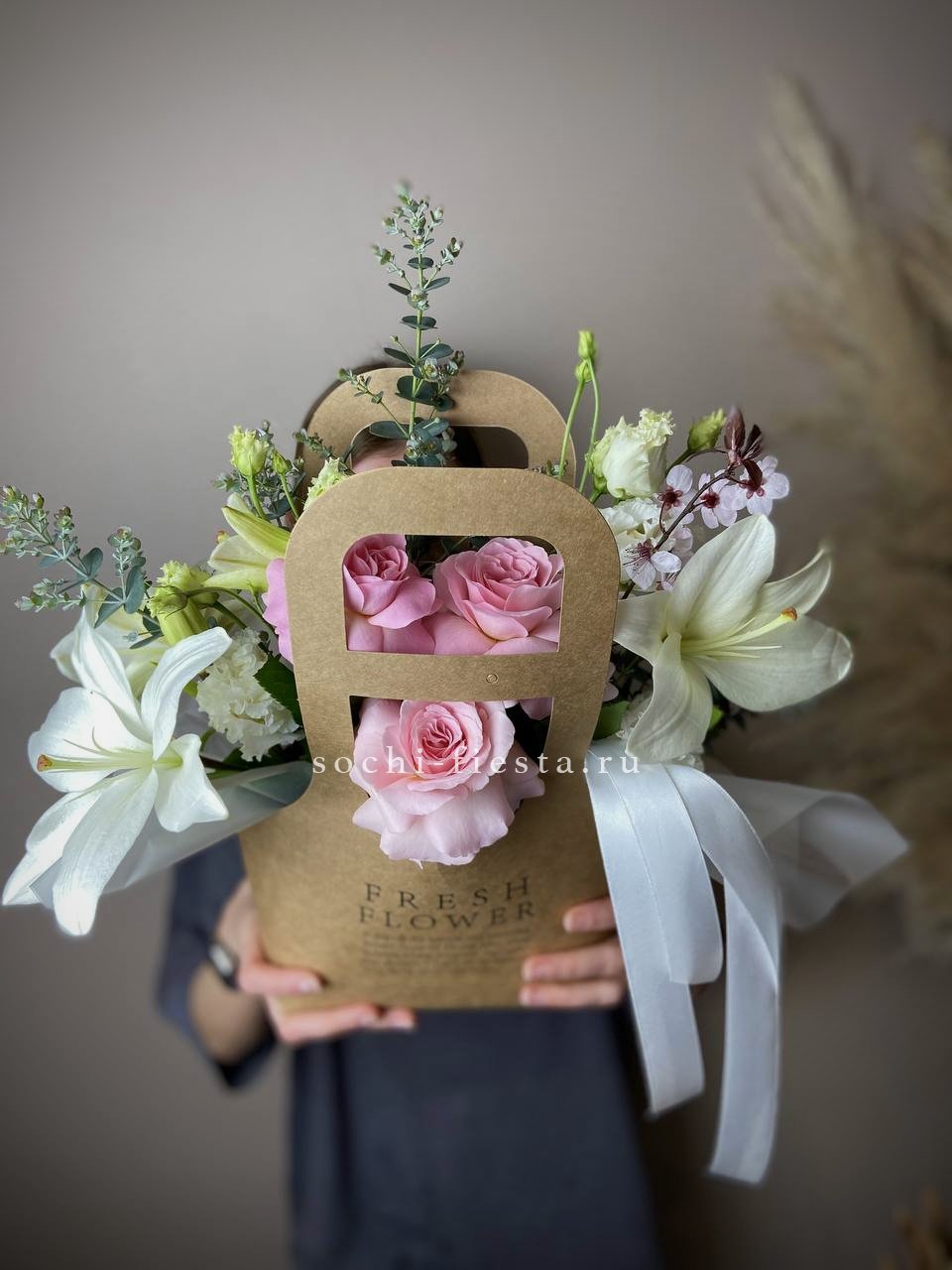Миниатюрная композиция в удобной сумочке сочетает пышные головки хризантем с бархатистыми розами и воздушным диантусом. Веточки эвкалипта добавляют свежести, а компактная форма позволяет разместить цветы на рабочем столе или прикроватной тумбе.