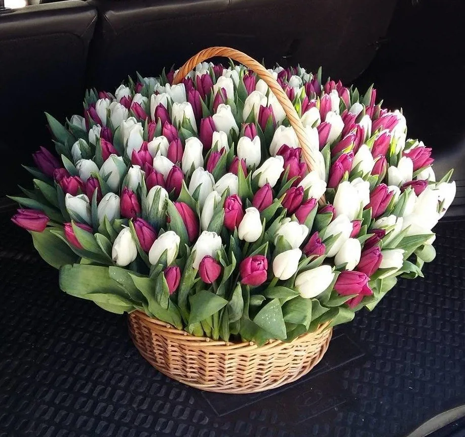 Сто пятьдесят один тюльпан в плетёной корзине — это масштабное цветочное высказывание. Разноцветный микс создаёт живописное полотно, наполненное весенней энергией и движением.