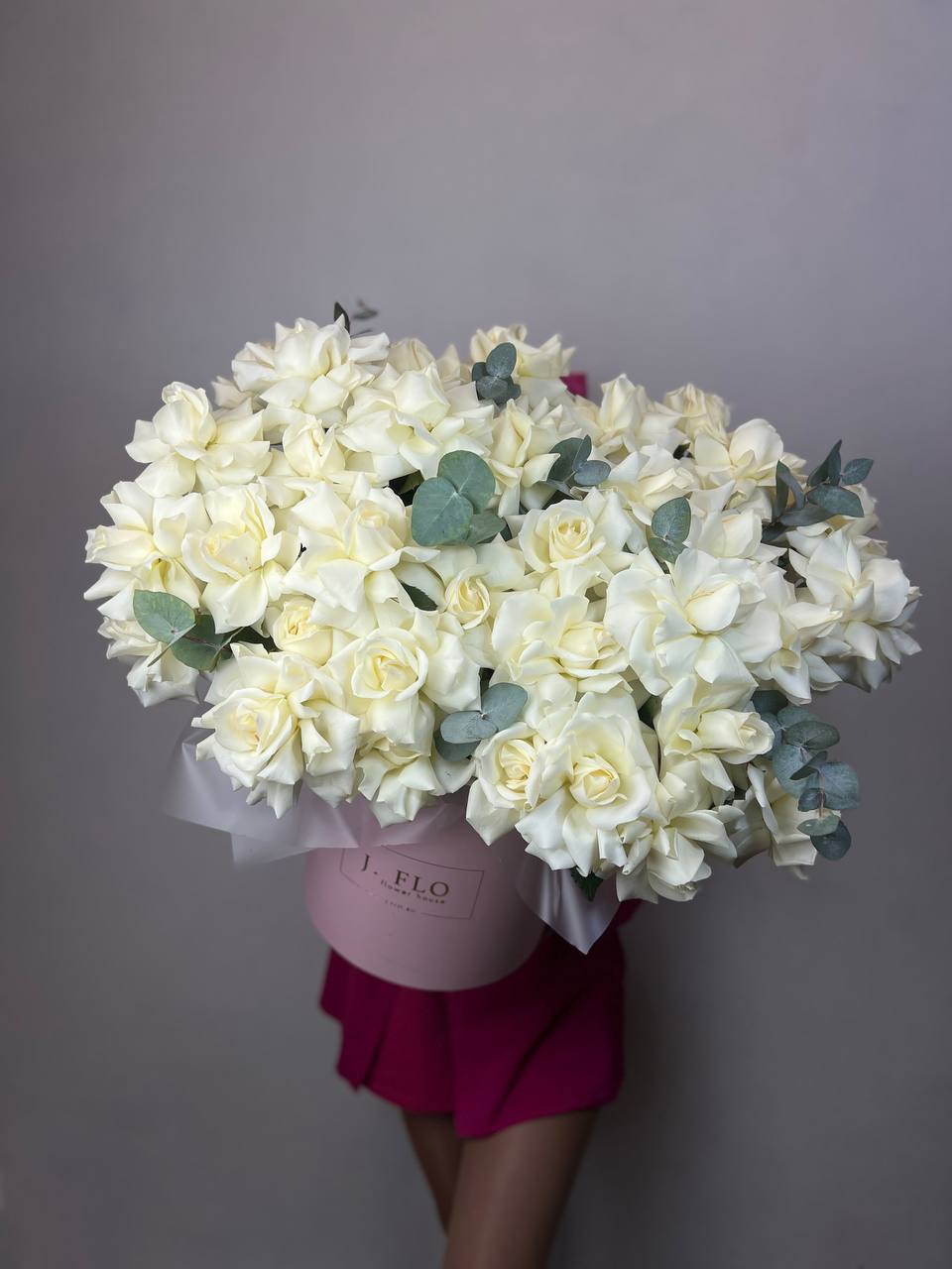Пышная гортензия задает объем, эустома и диантус заполняют пространство между крупными бутонами. Статица добавляет графичность, а розы бомбастик завершают композицию.