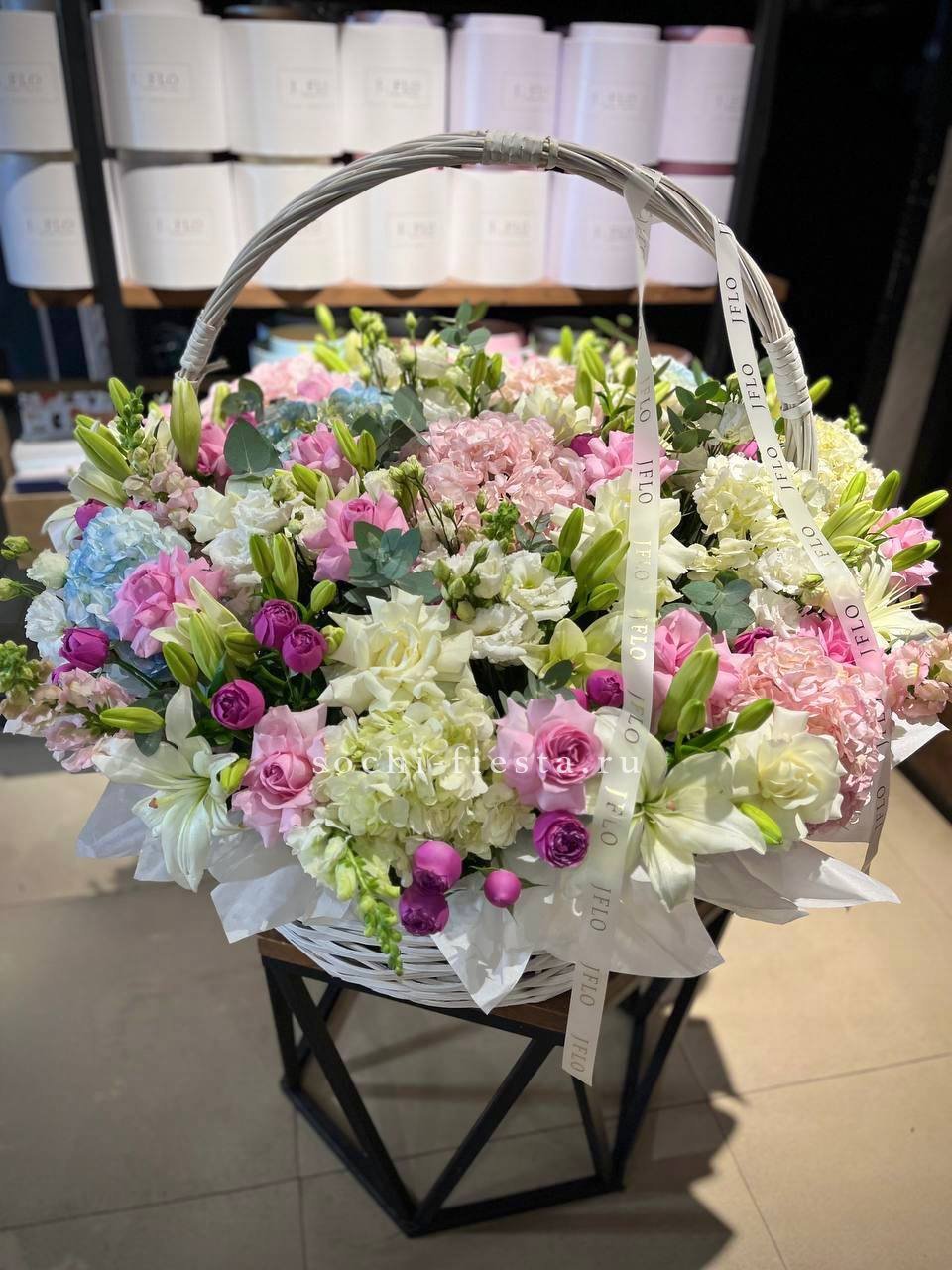 гортензии, лилии, хризантемы, пионы, лимониум, маттиола, корзина.