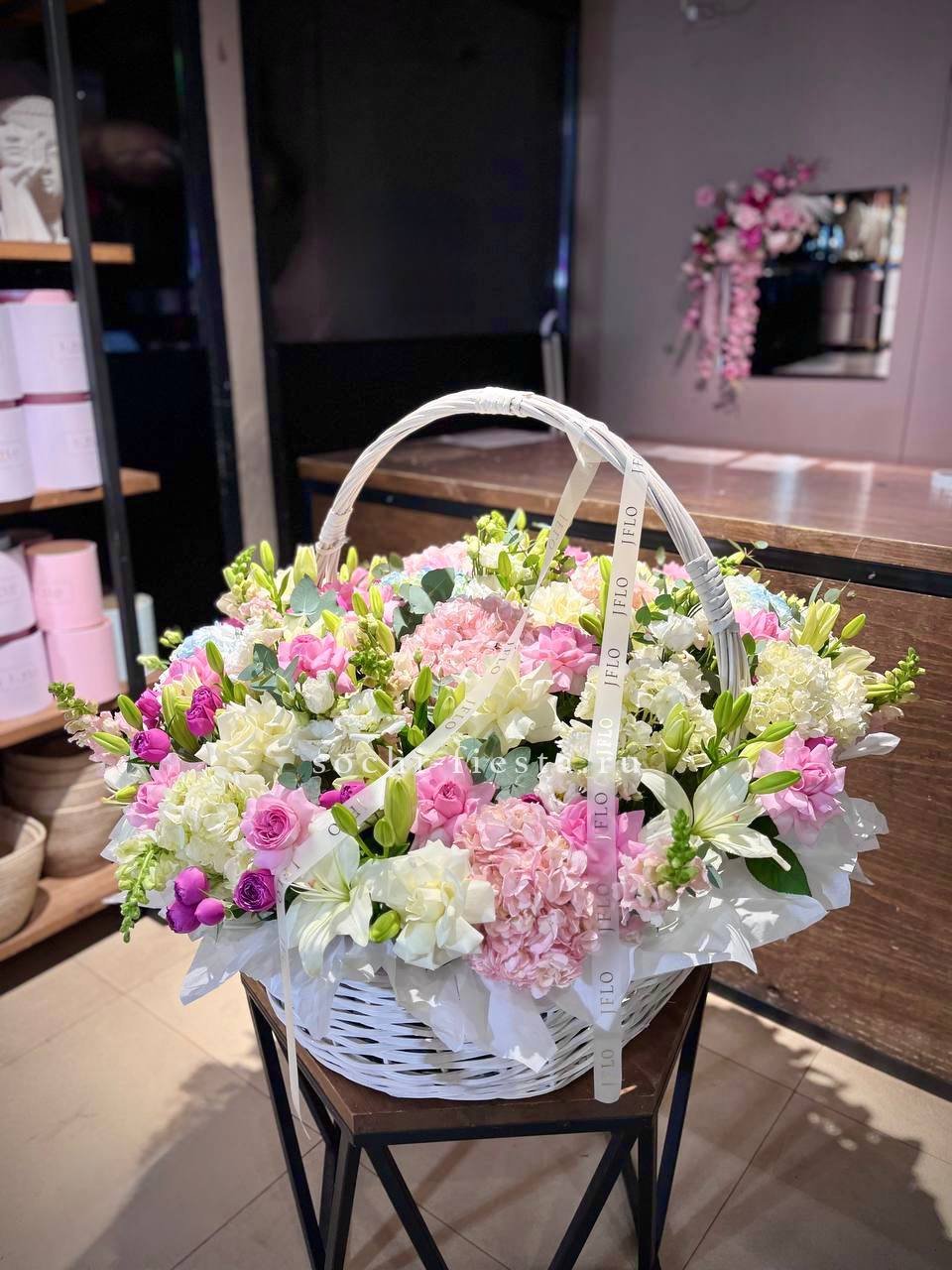 Пышная корзина объединяет летнее буйство красок: насыщенные гортензии, распустившиеся лилии, яркие хризантемы и пионы с матовым лимониумом. Композиция создает ощущение солнечного дня, наполненного светом и теплом.